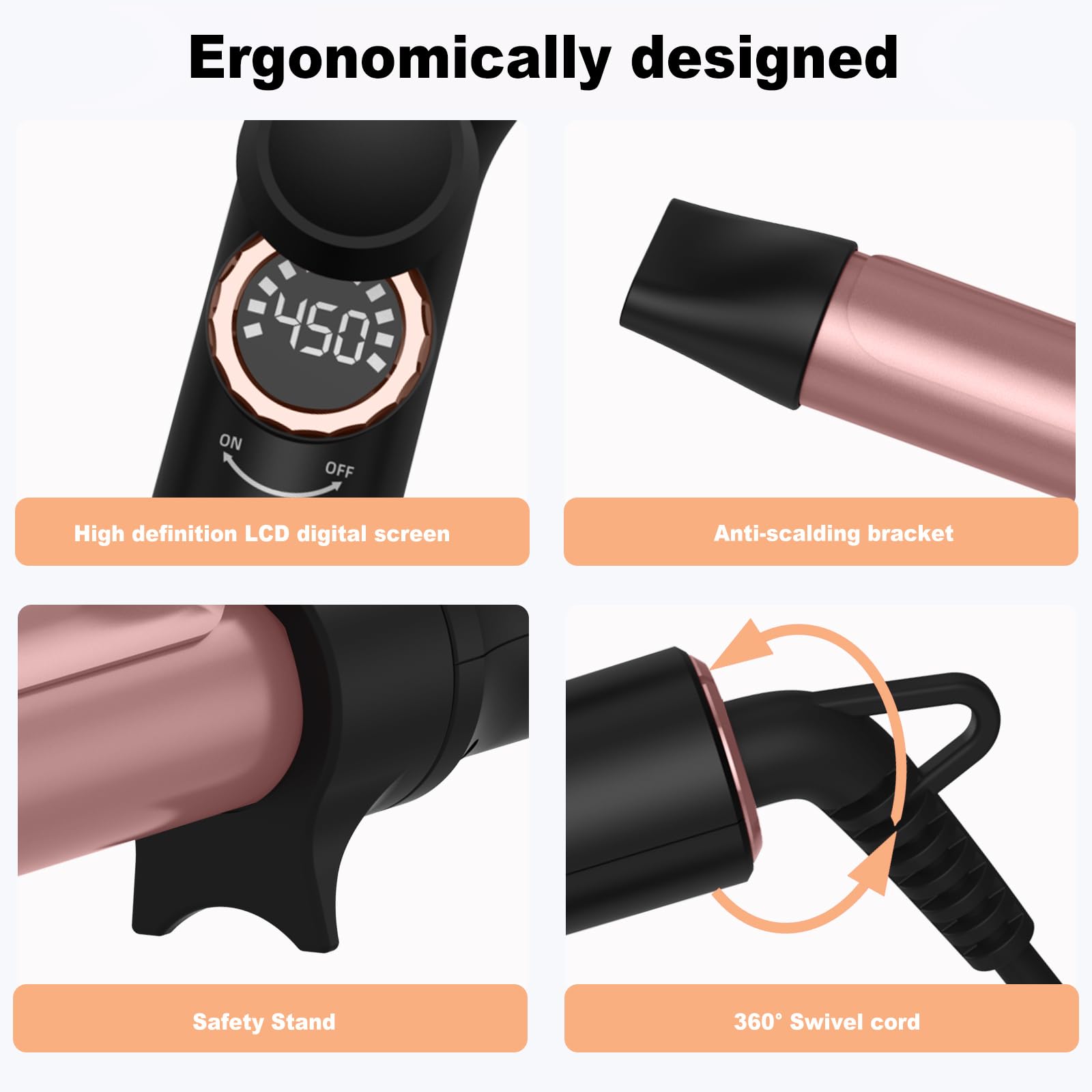 - 5 Temperature Settings Curling Iron 1 1/4 Inch:This barrel curling iron has 5 temp settings from 290°F to 450°F.Hair curling iron has LCD for precise temperature control. Suitable for all hair types,both fine and soft hair and coarse and hard hair.