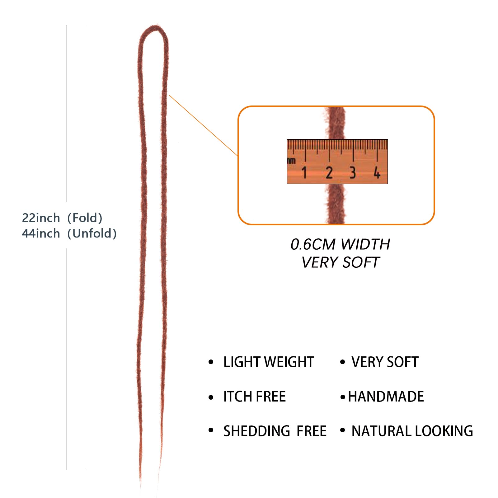 - Size & Weight: Our double dreadlocks measure a generous 22 inches when folded, and an impressive 44inches when fully extended. Despite their length, they're incredibly light, weighing only approximately 7g per strand. Their thin width of 0.6cm per strand adds to their airy, barely-there feel.