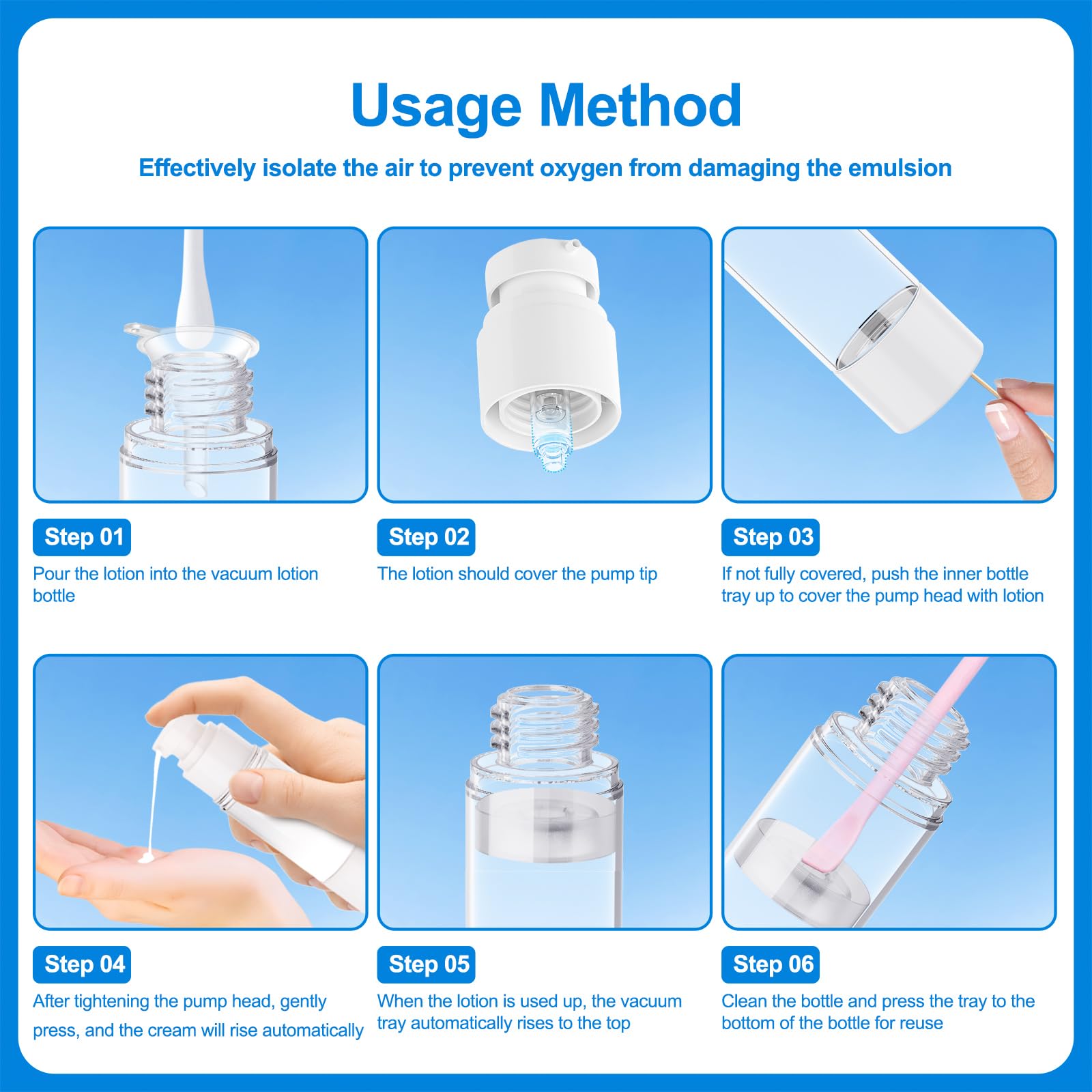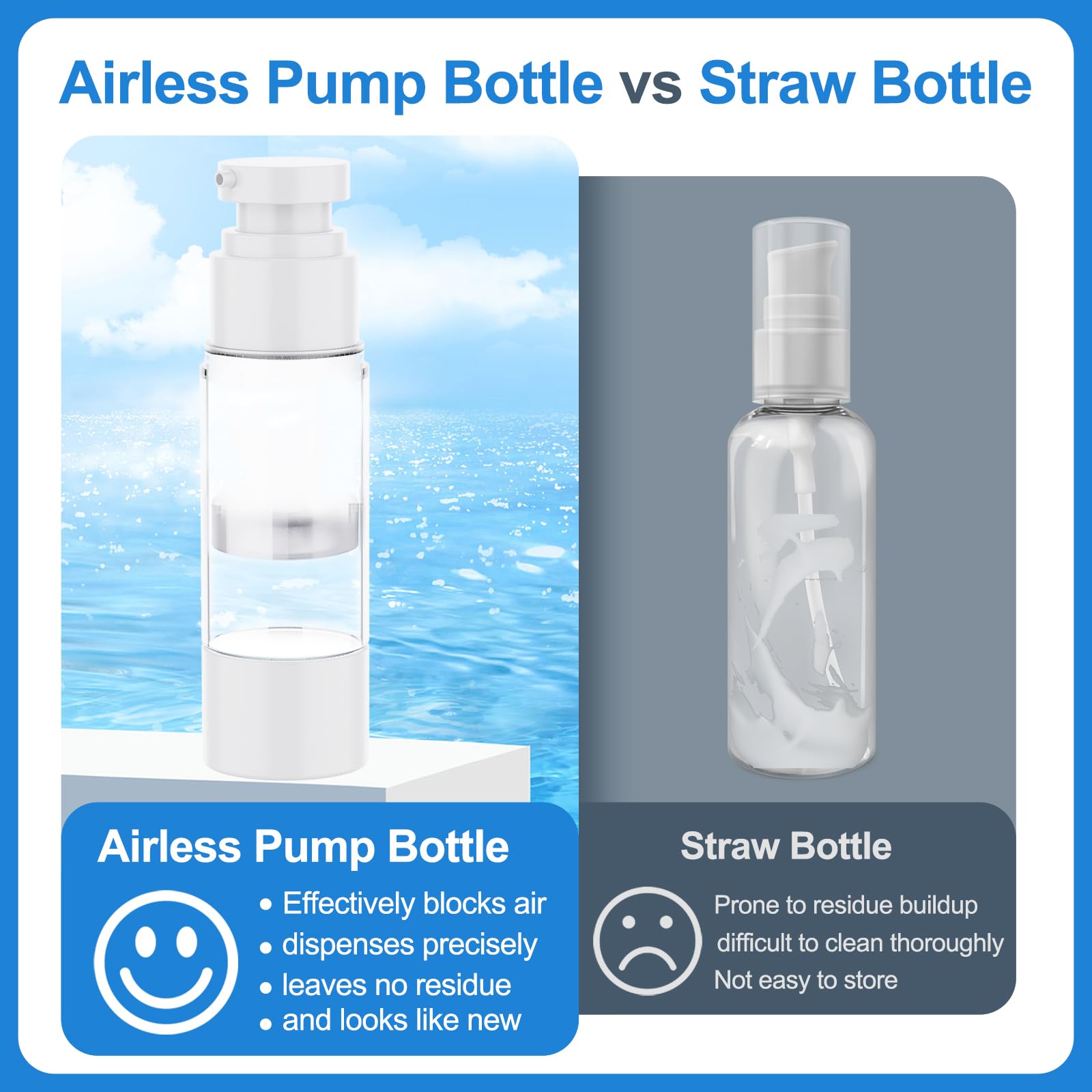 - AIRLESS PUMP DESIGN:Our airless pump jars adopt an innovative airless pump design,which can effectively isolates air to reduce oxidation, ensuring the long-lasting efficacy of your skincare products