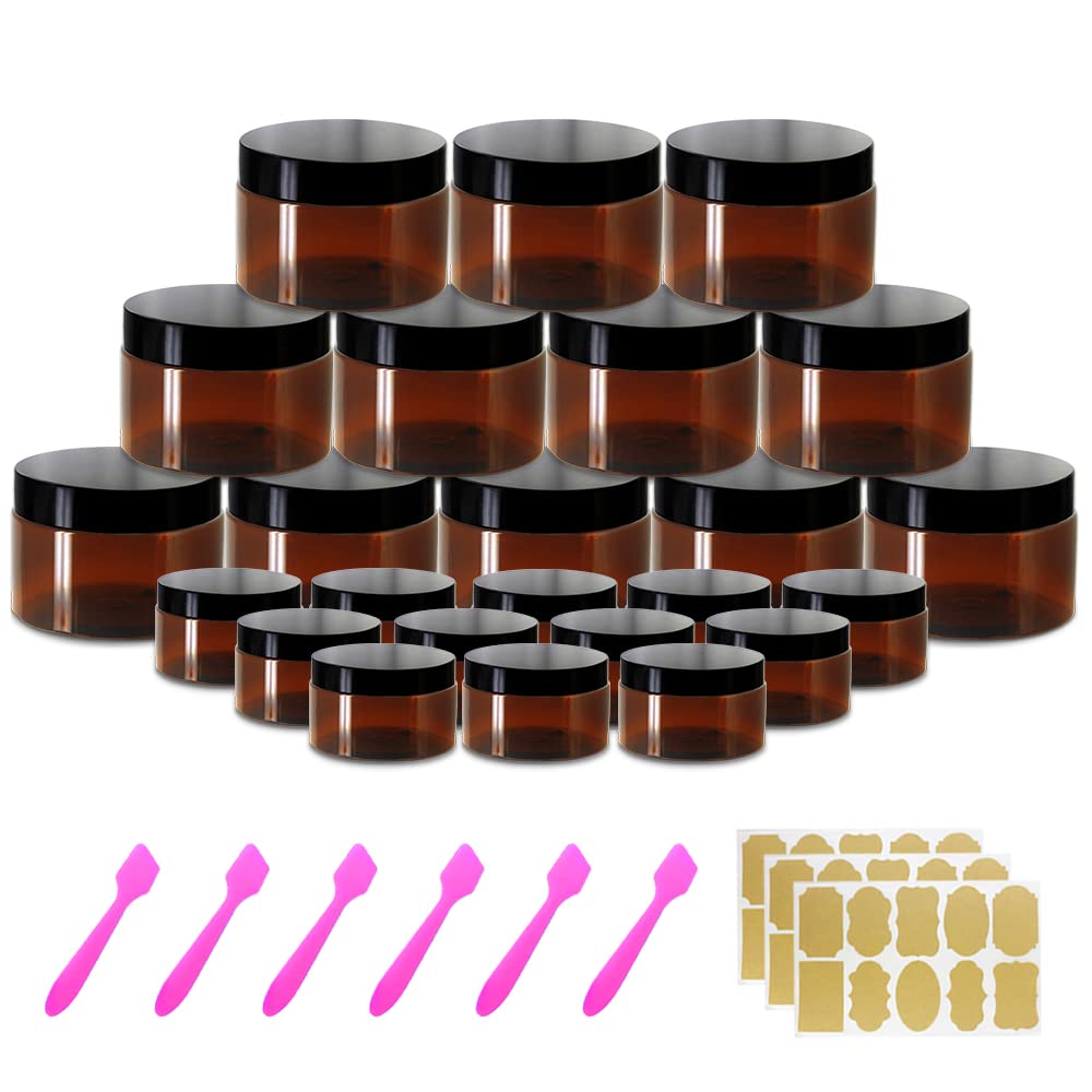 - 【PACKAGE INCLUDES】-0.7oz x 12pcs & 4oz x 12pcs, total 24 pcs cosmetic containers with brown lids, which is convenience for different uses. You will also get 30 x decorative labels for distinction and 6 x spatulas for dispensing or mixing.