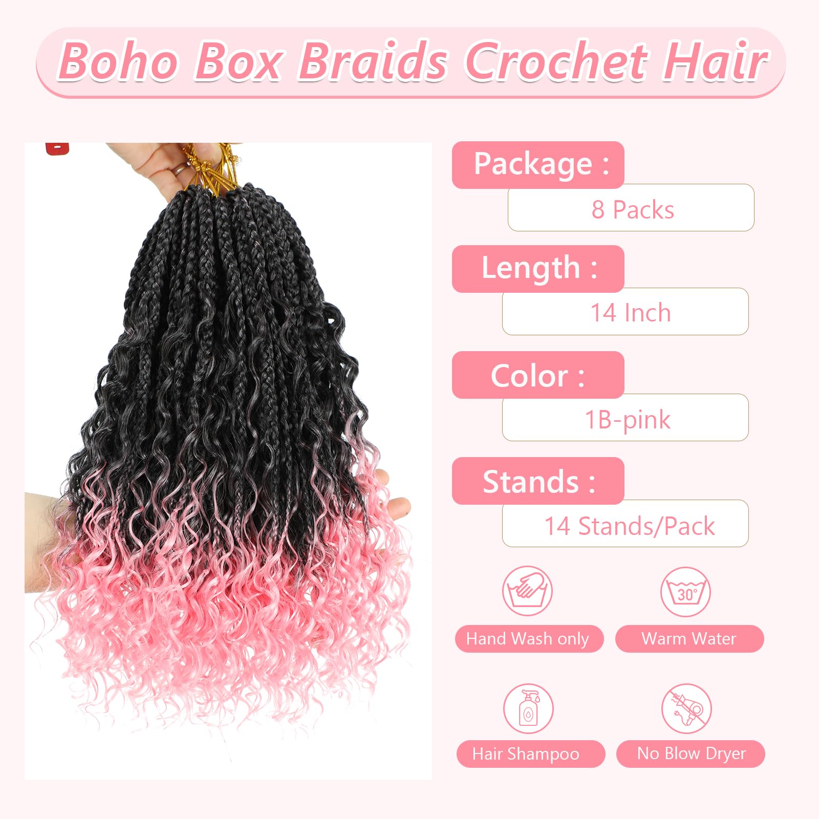8 Packs Crochet Box Braids- 14 Inch Bohomian Box Braid Crochet Hair Synthetic Braiding Hair Goddess Box Braids Crochet Hair for Black Women(14(8Packs), 1B/Pink)