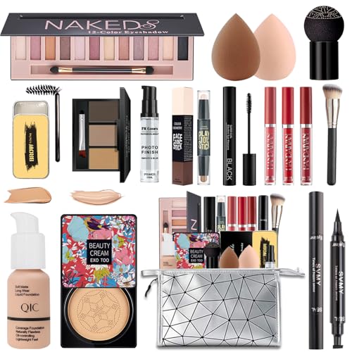 All in One Makeup Kit,Includes Naked Eyeshadow,Liquid Foundation,CC Cream,Lipstick Set,Mascara,Makeup Brush,Makeup Sponge,Eyebrow Powder,Eyebrow Soap,Eyeliner Stamp, Primer,Contour Stick,Cosmetic Bag