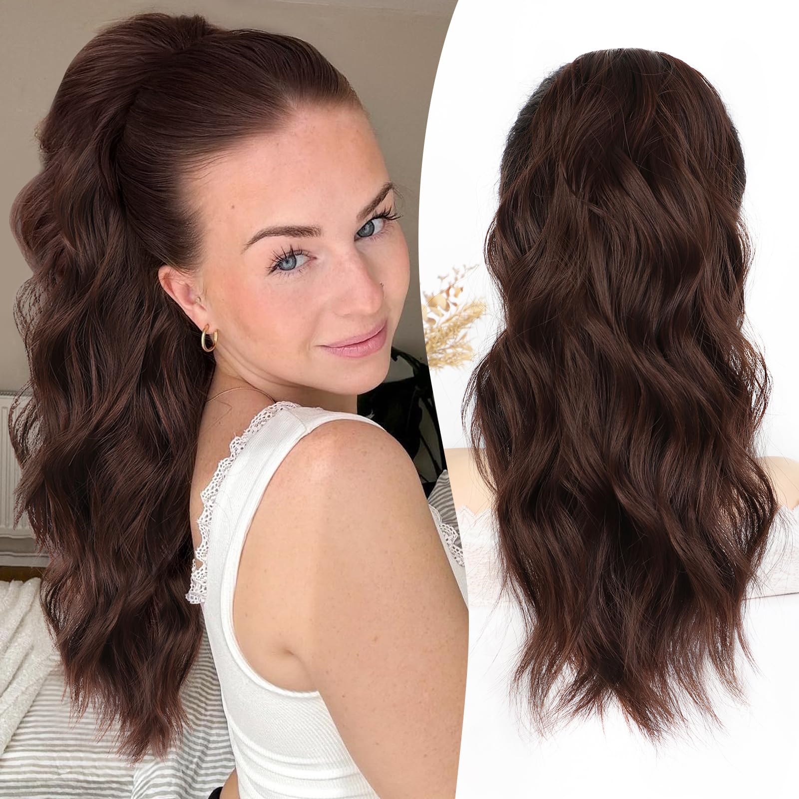 ALXNAN Ponytail Extension,16 Inch Claw Ponytail Hair Extensions for Women,Claw Clip in Long Wavy Synthetic Chestnut Brown Ponytail Extension for Daily Use.