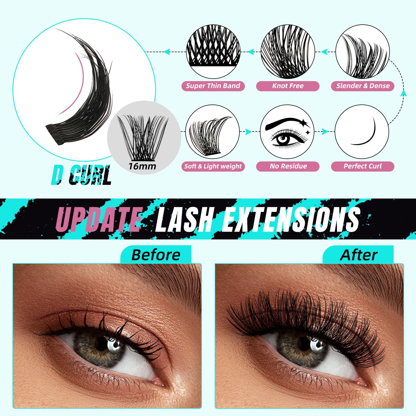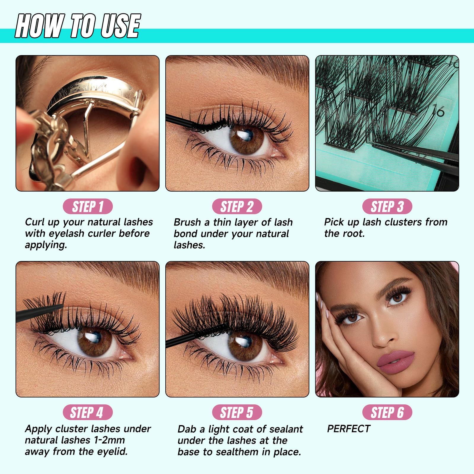 - How to use: First, use eyelash tweezers to apply lash extension clusters, then apply eyelash extension glue on the false eyelashes. Then, match the wispy lash clusters to suit your style, arranging them below your natural lashes 1-2 mm from your eyelids. Finally, apply a thin layer of lash lock to your wispy lashes. You're done! Even beginners can easily master the usage techniques.