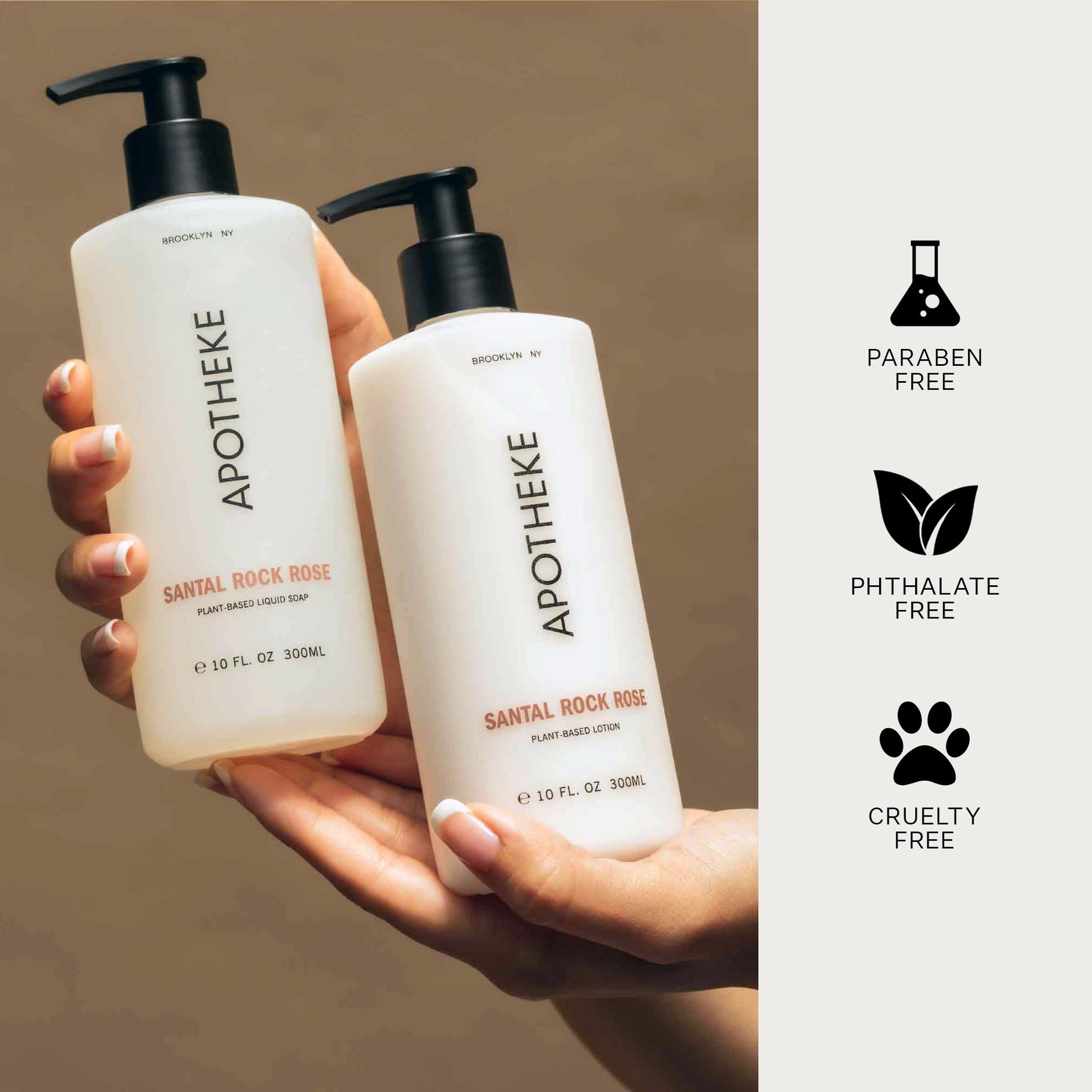 - Nourishing Hand & Body Lotion: Experience soft, hydrated skin with Santal Rock Rose lotion, a nourishing and fast-absorbing moisturizer from APOTHEKE. Made with plant-based ingredients that hydrate while lightly scenting the skin. Each bottle is 10 fl oz and measures 2.5 x 6.5 inches.