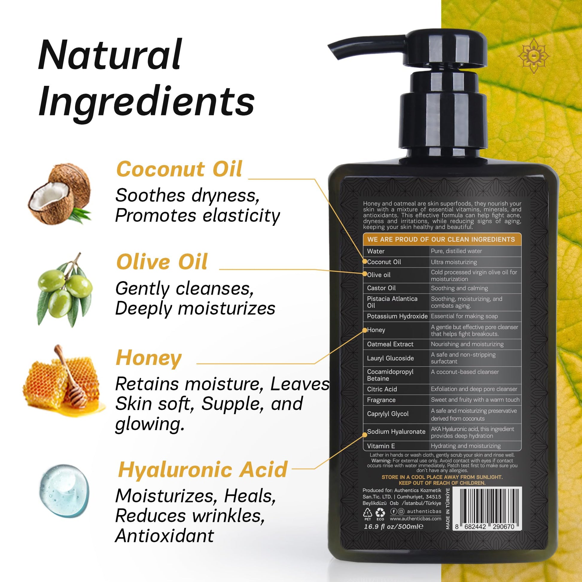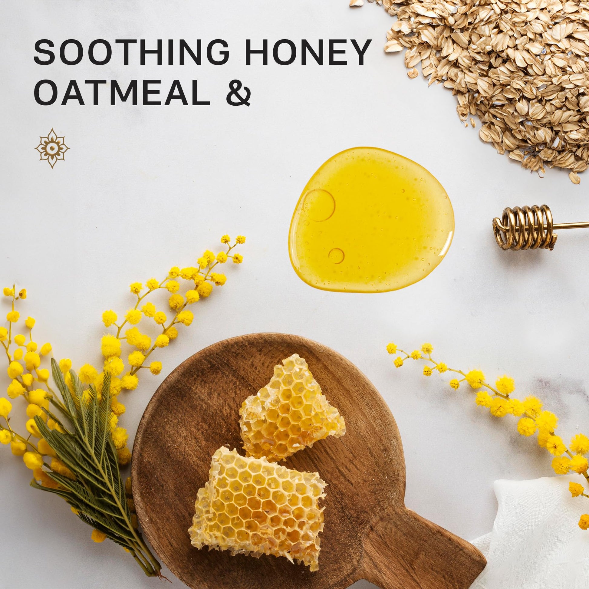 - NOURISHING HONEY AND OATMEAL - Infused with natural organic honey and oatmeal, known for their moisturizing and soothing properties, perfect for all skin types including sensitive skin.