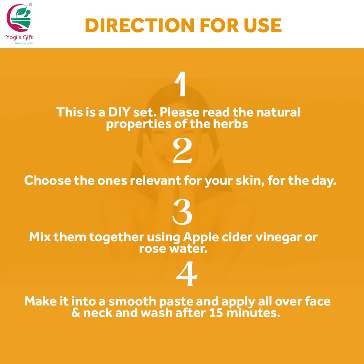 - ★ 𝗛𝗢𝗪 𝗧𝗢 𝗨𝗦𝗘: This is a DIY set. Please read the natural properties of the herbs and choose the ones relevant for your skin, for the day. Mix them together using Apple cider vinegar or rose water. Make it into a smooth paste and apply all over face & neck. Wash after 15 minutes