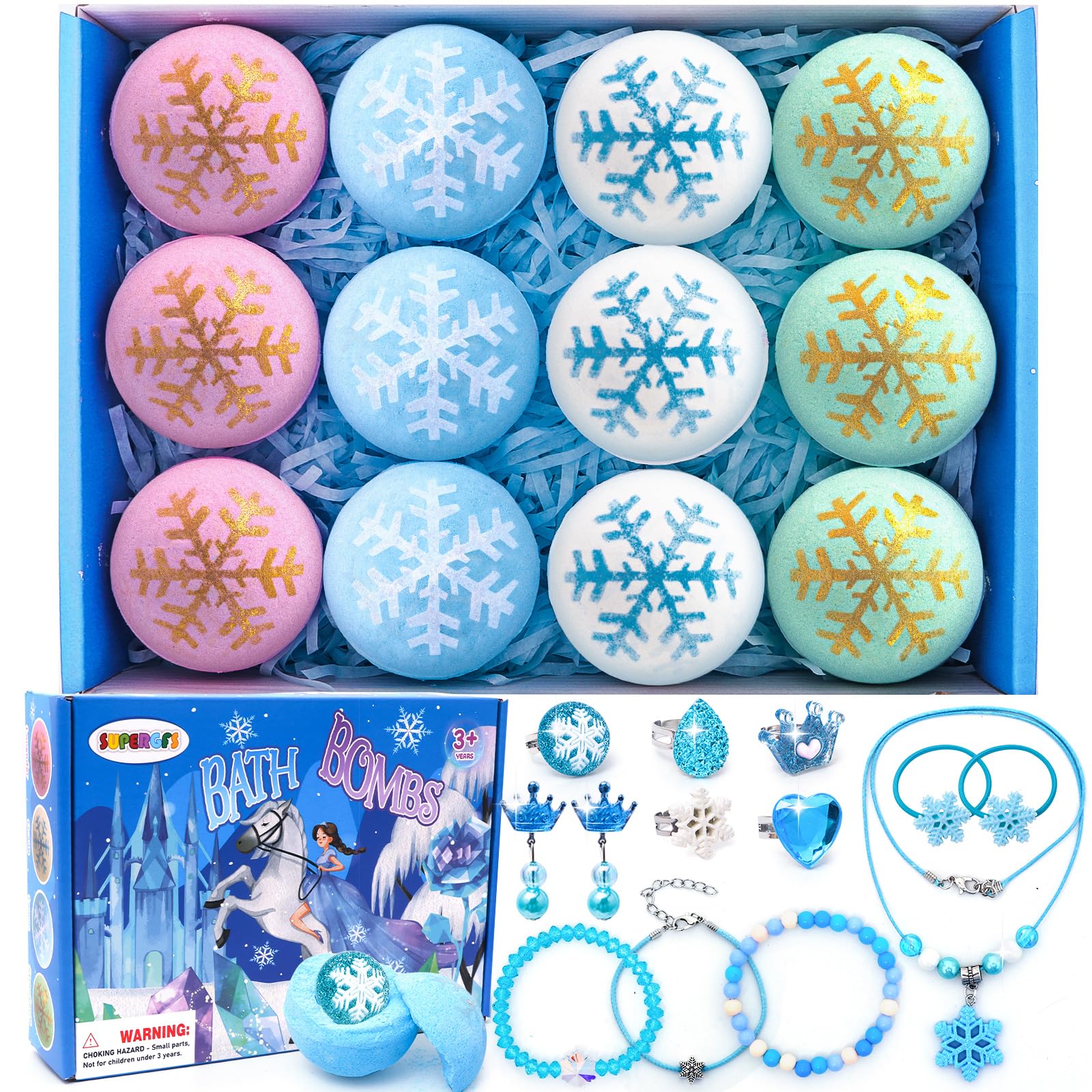 - Bath Bombs with Surprise Inside - Our kids bath bomb gift set includes 12 bath bombs with princess jewelry toy inside. 3 bracelets, 5 rings, 1 necklace, 1 pairs earrings, 1 pairs of hair ties. Cute princess toys add fun to the bath.