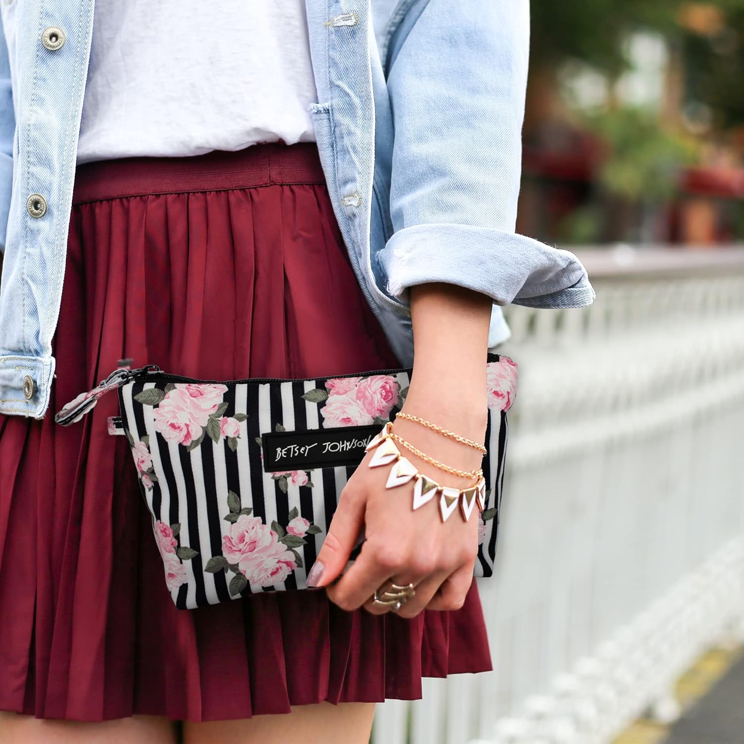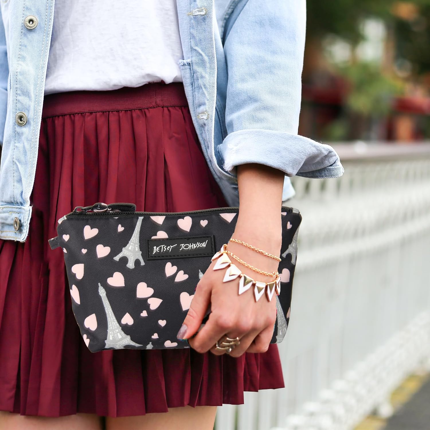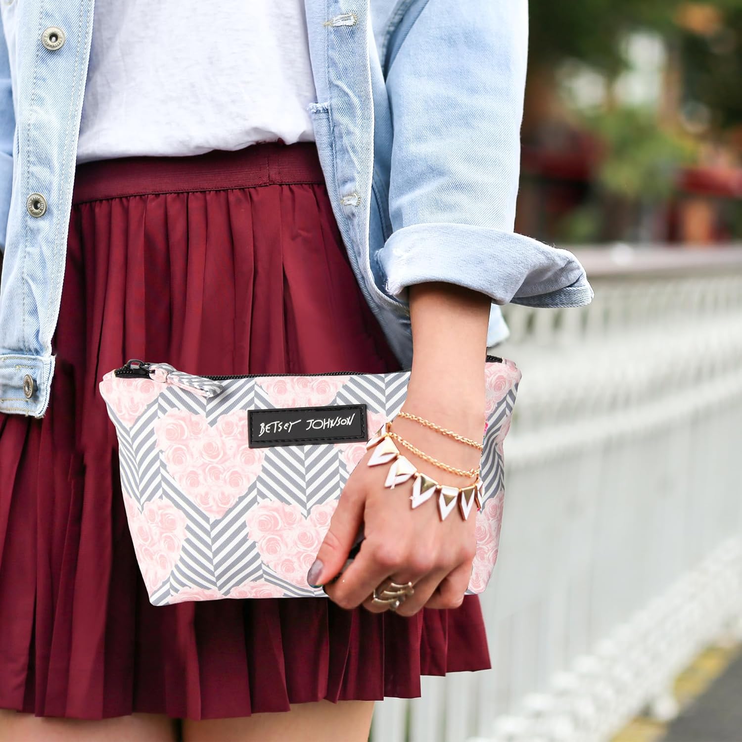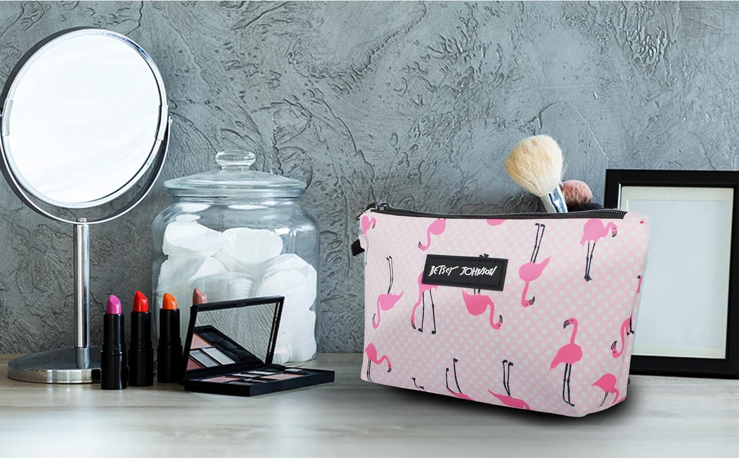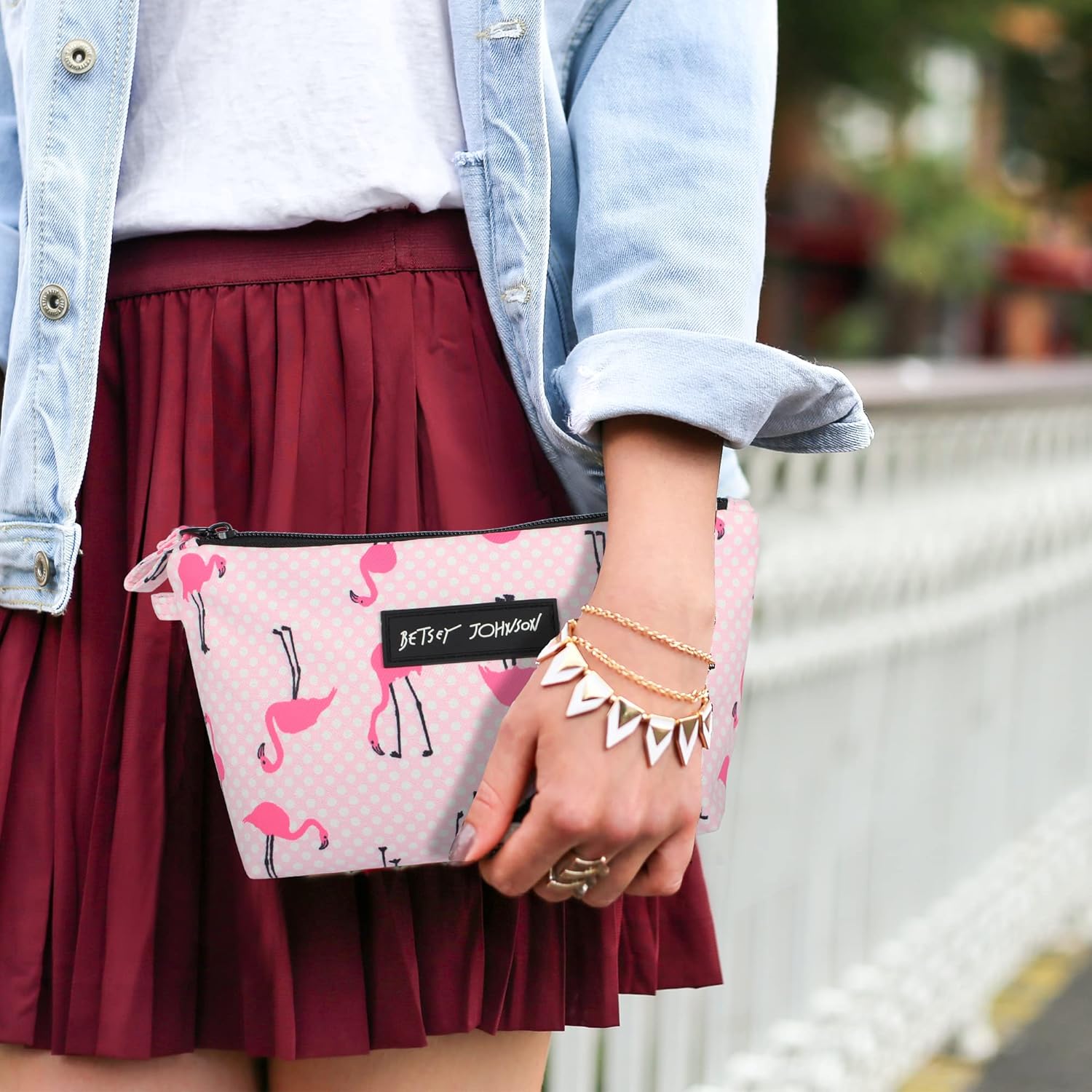 The Betsey Johnson cosmestic pouch delivers great durability together with a fashionable design, which is perfect for travelers who value both style and function. The brand also has other types of product such as hardside luggage, tote bag pouch, id bag in the same pattern to match with easily.The small cosmetic bag is made of 100% polyester to provide your belongs with maximized protection. It's lightweight, practical features and roomy space are good for everyday uses in all occasions to carry the most of your needs such as makeup, travel etc. It would serve as the best pouch purses for women.Approx.