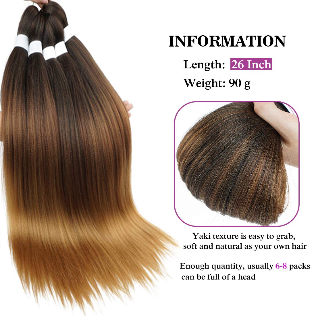 - Ombre Braiding Hair: Pre stretched to save a lot of prep time. Yaki texture is easy to grab. perfect for box braids, Senegalese twists, crochet braids, and ponytail