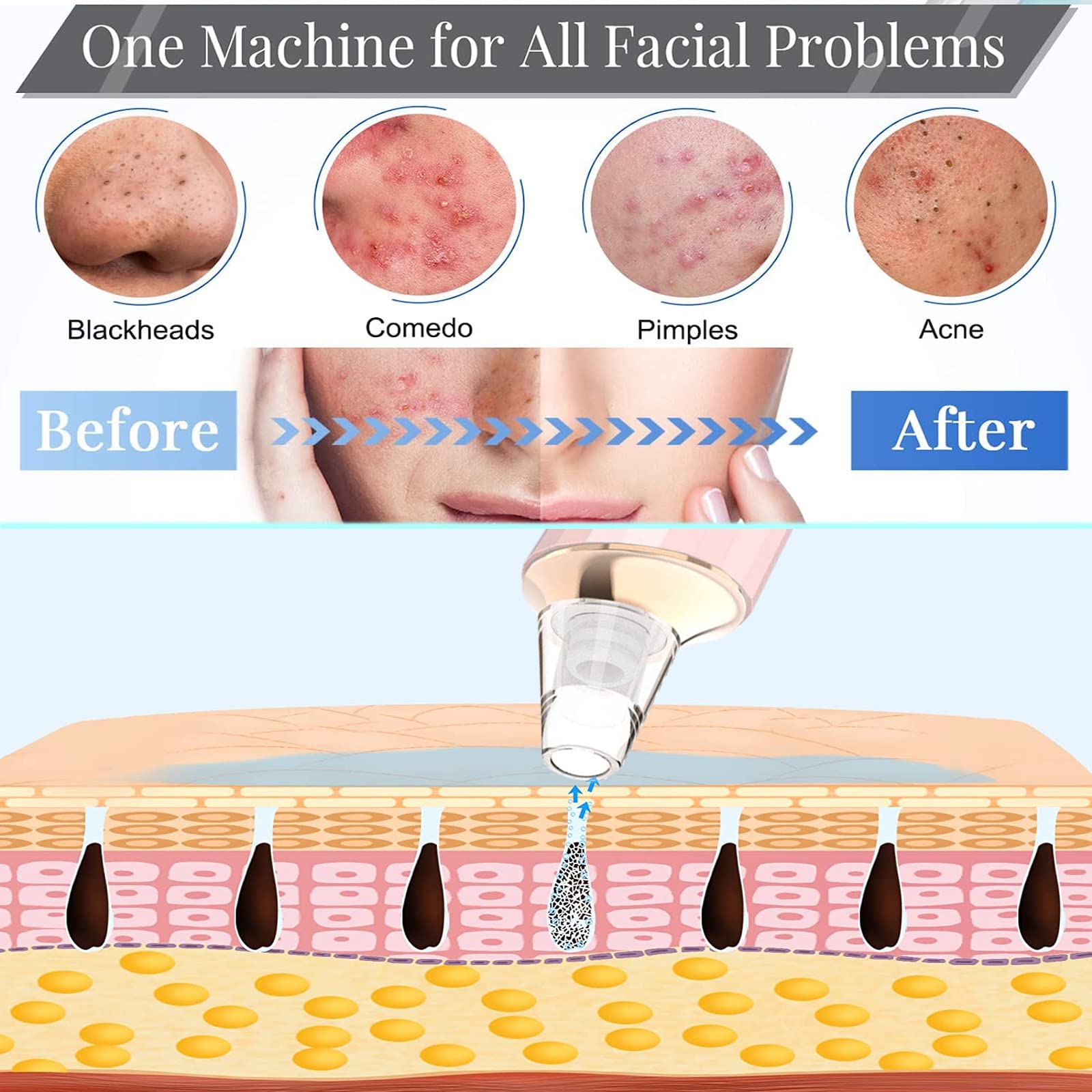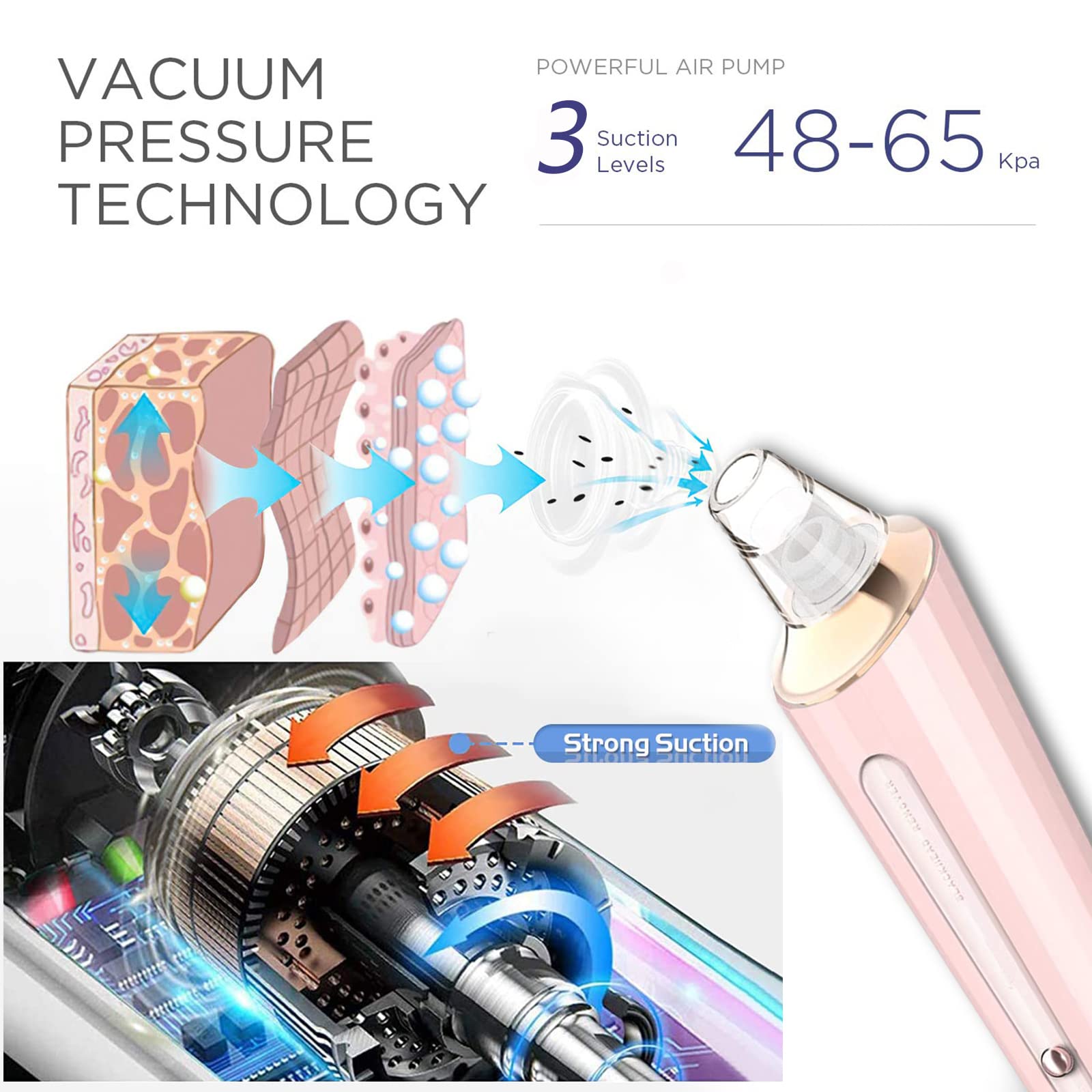 - ♕【Powerful Blackhead Vacuum Tech】The blackhead remover ultra-powerful suction level, Maximum to 60kp. Effectively cleans the oil, blackhead, grease and acne in the clogged pores. Also increase blood circulation & skin elasticity,clean skin,tighten skin,smooth you're fine lines.Help you recover from common facial skin problems.