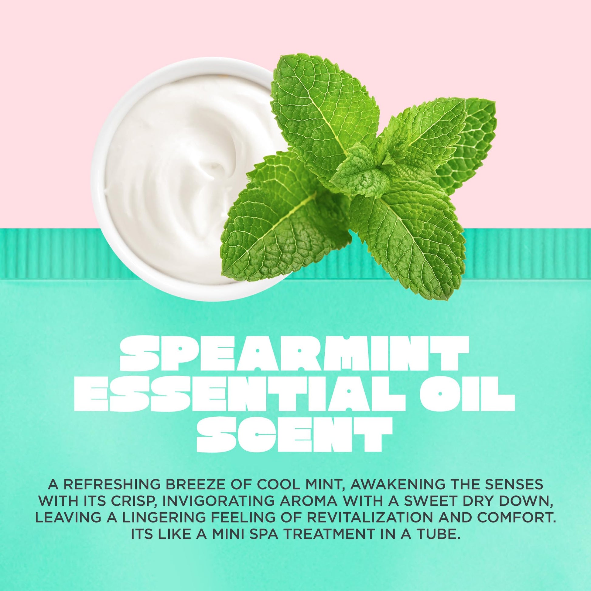 - SPEARMINT ESSENTIAL OIL: A refreshing breeze of cool mint, awakening the senses with its crisp, invigorating aroma with a sweet dry down, leaving a lingering feeling of revitalization and comfort. Its like a mini spa treatment in a tube.