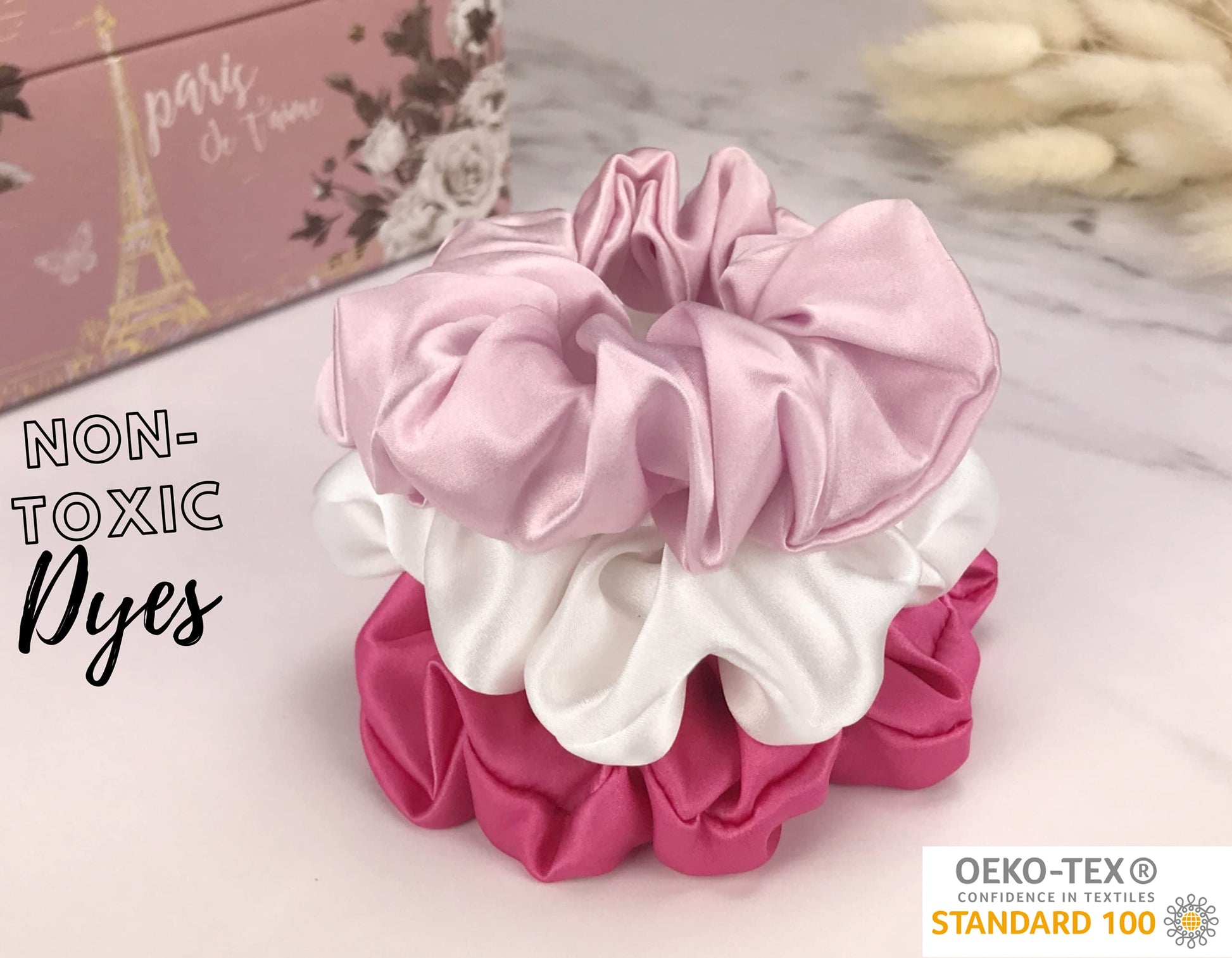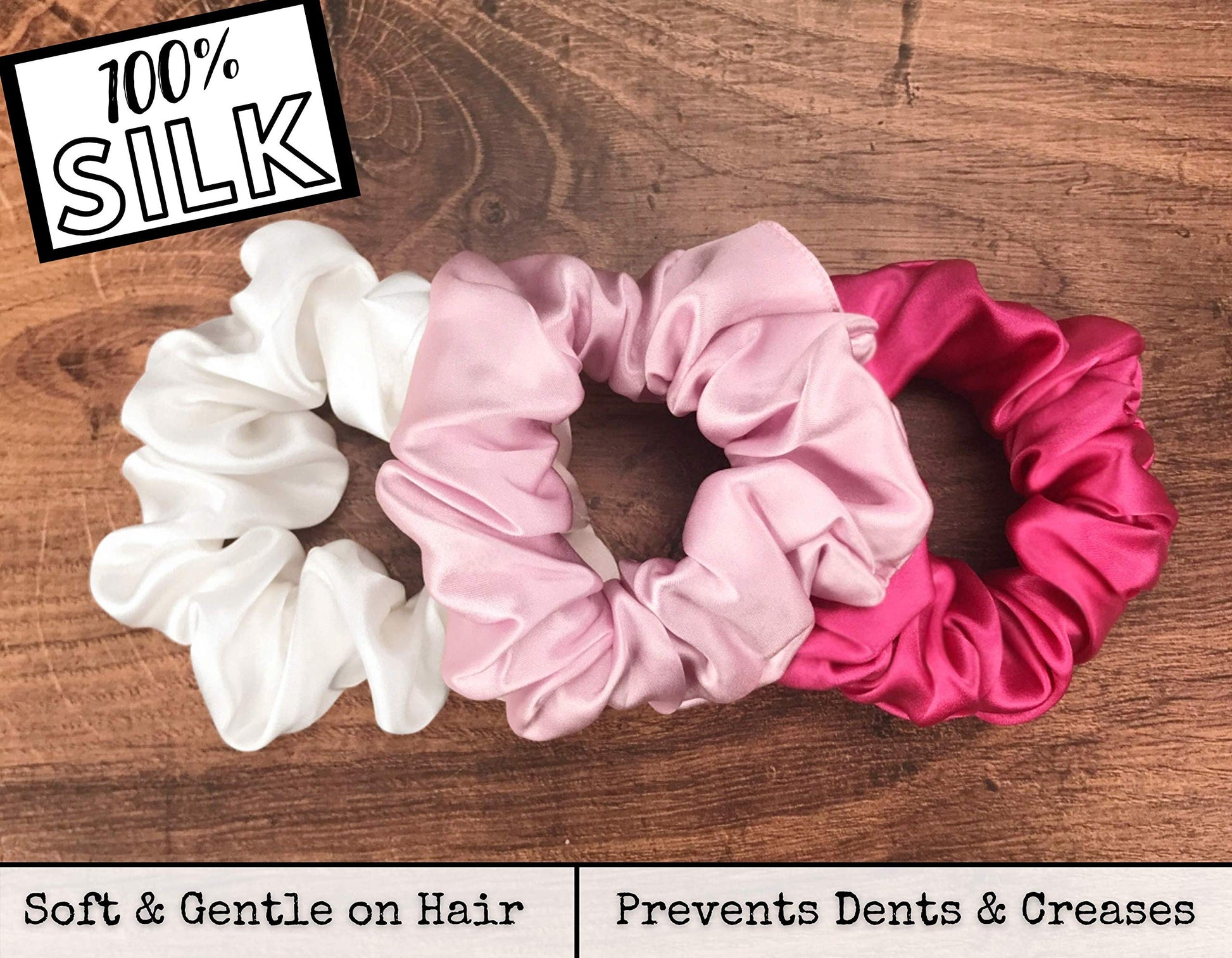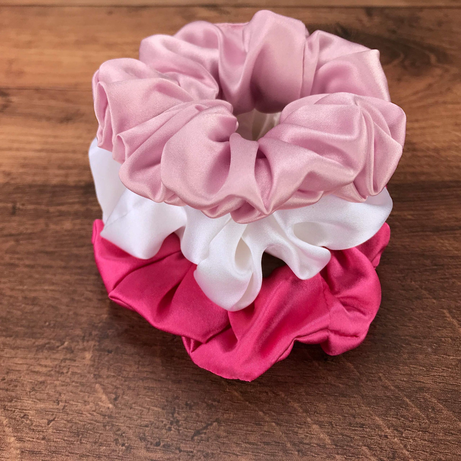 - SILK SCRUNCHIES 3 PACK contains one scrunchie of each color: Hot Pink, Soft Pink and White