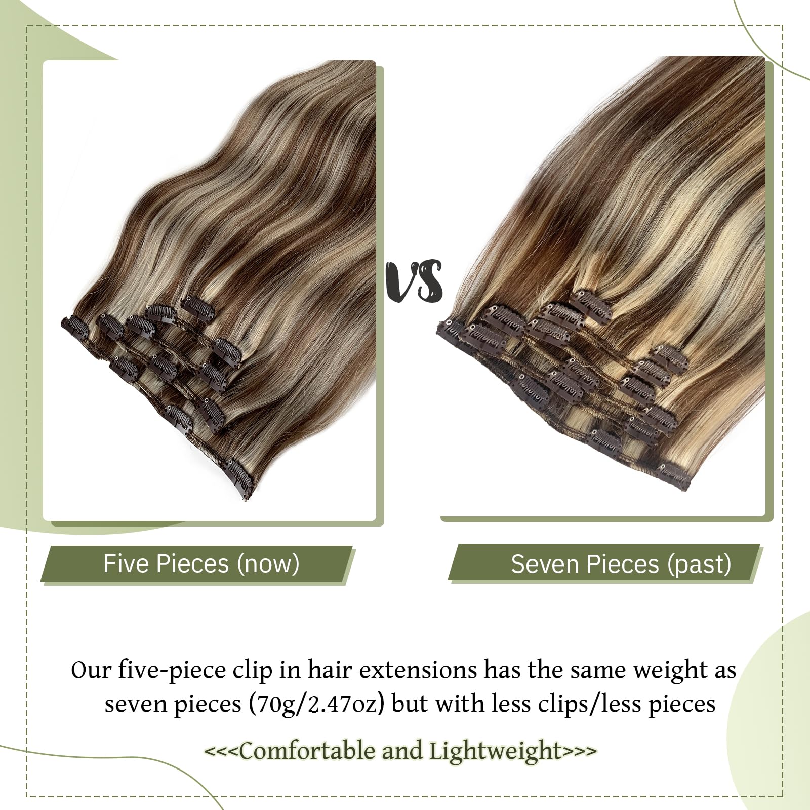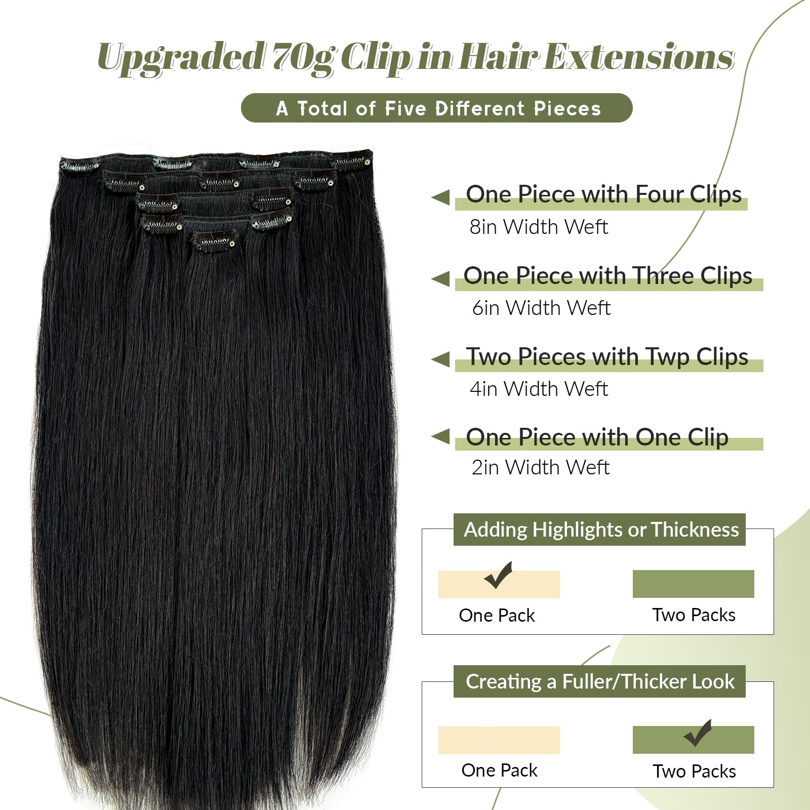 - Clip in Hair Extensions Specification: recently we have upgraded clip in hair extensions based on professional suggestions from our royal customers, each set only has 5 pieces with same weight as usual (70 grams per pack) and now the hair extensions are fuller than those 70 grams with 7 pieces, great for thin hair; PLS NOTE ONE PACK IS NOT ENOUGH FOR THICK LONG HAIR
