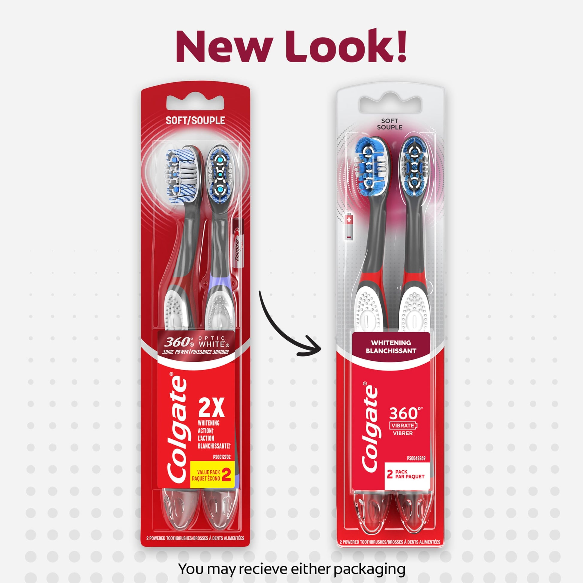 - Includes two (2) Colgate 360 Vibrate Whitening Battery-Operated Toothbrushes, 1 AAA battery included