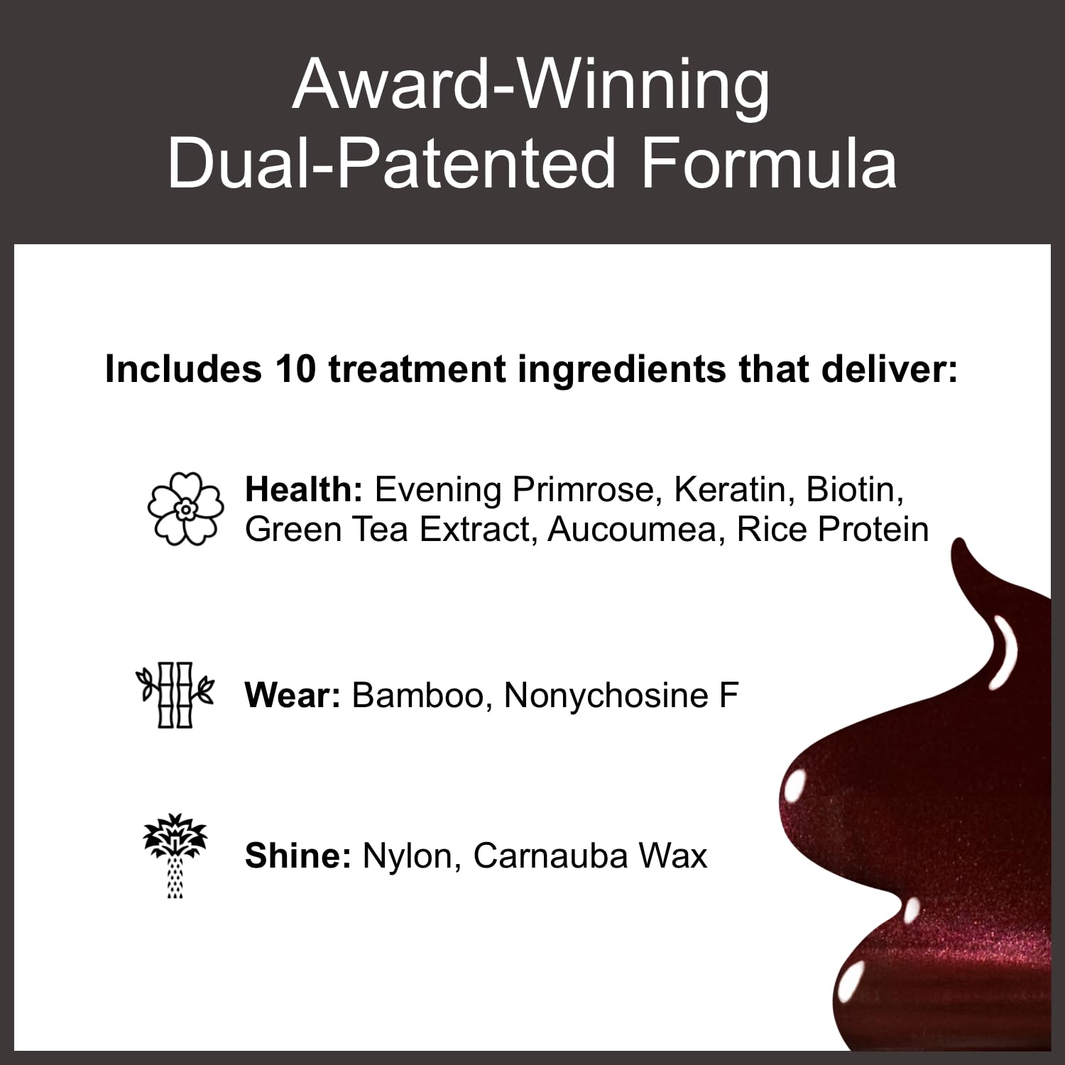 - TREATMENT ENRICHED FORMULA: This dual-patented nail polish formula delivers health, wear and shine with 10 exclusive ingredients to ensure optimum well-being and benefits for the nails. Requires no lamps or tools.