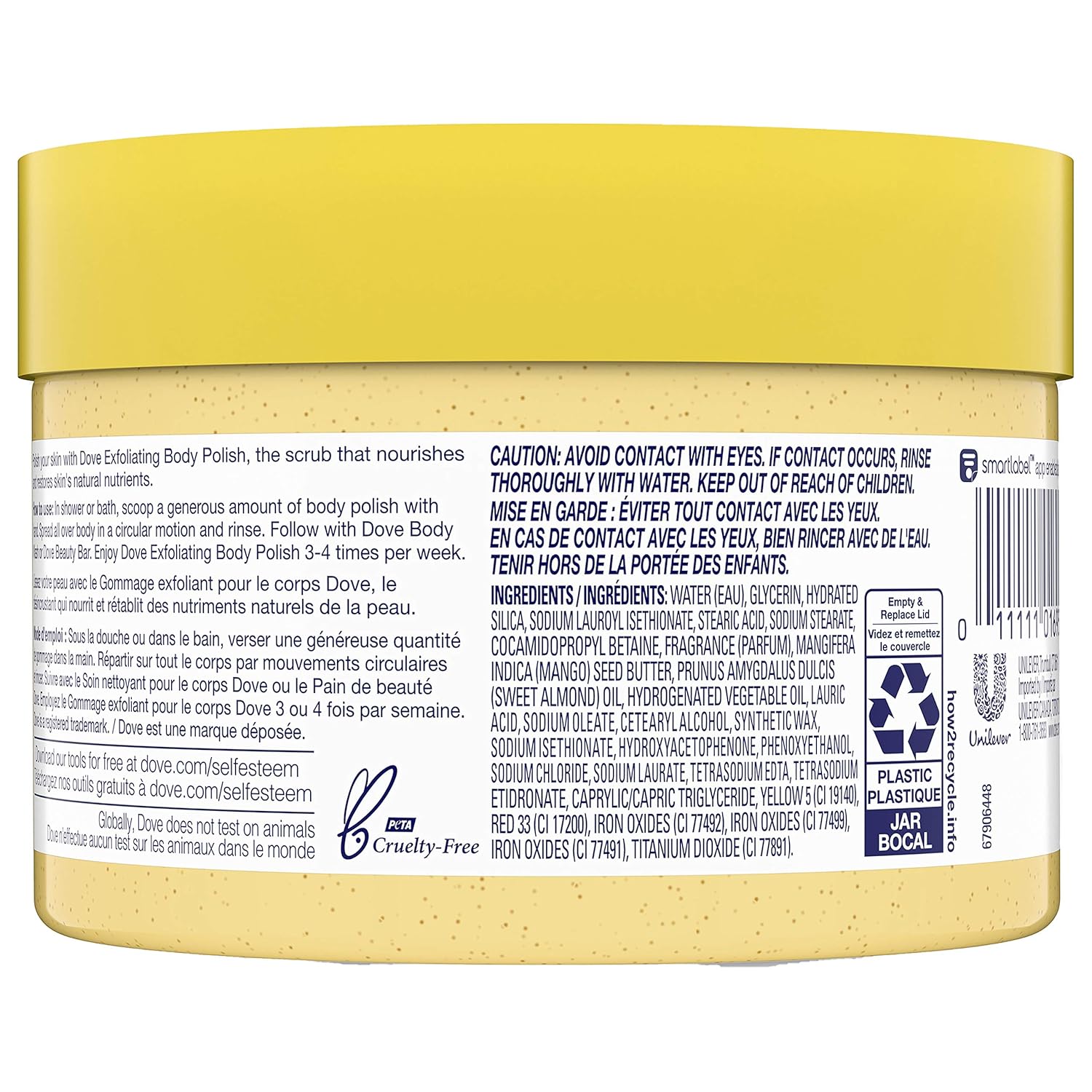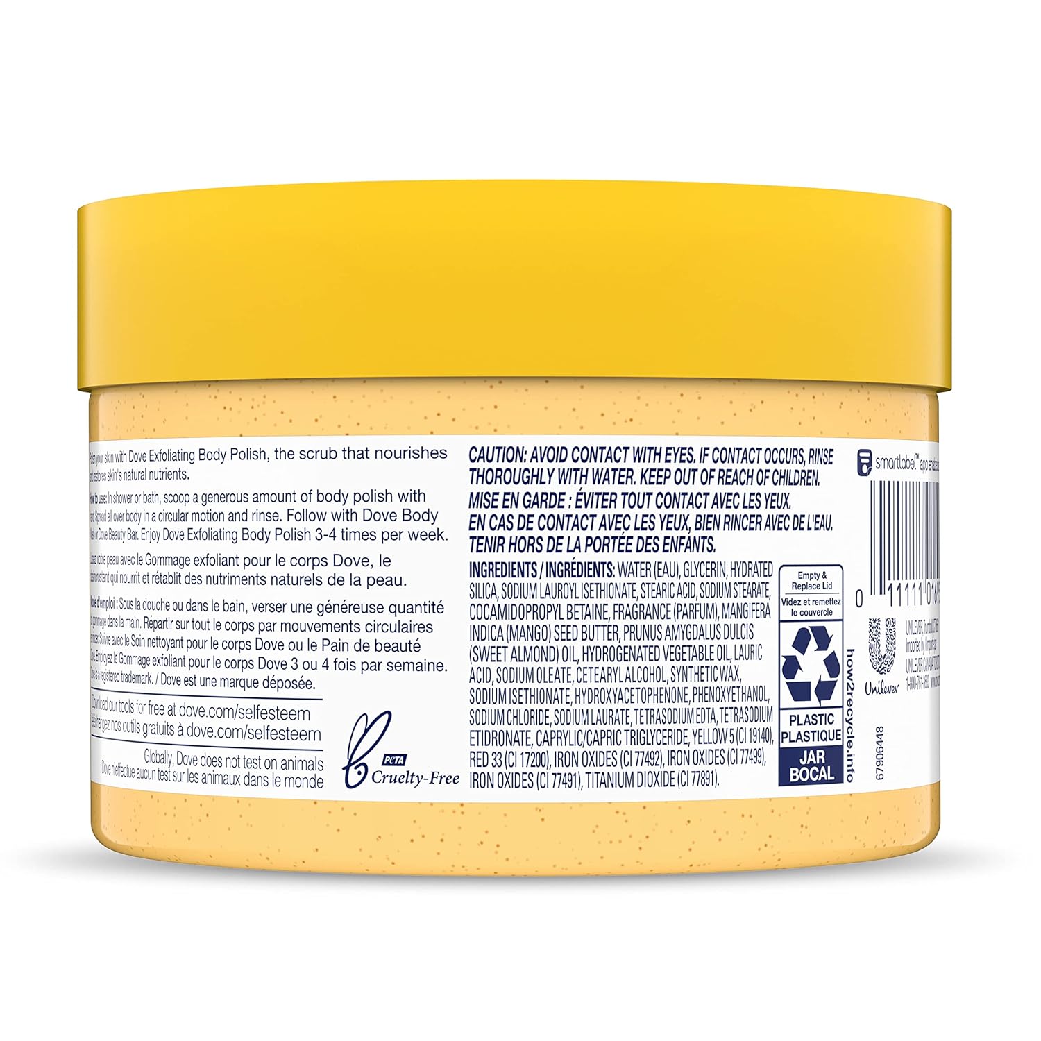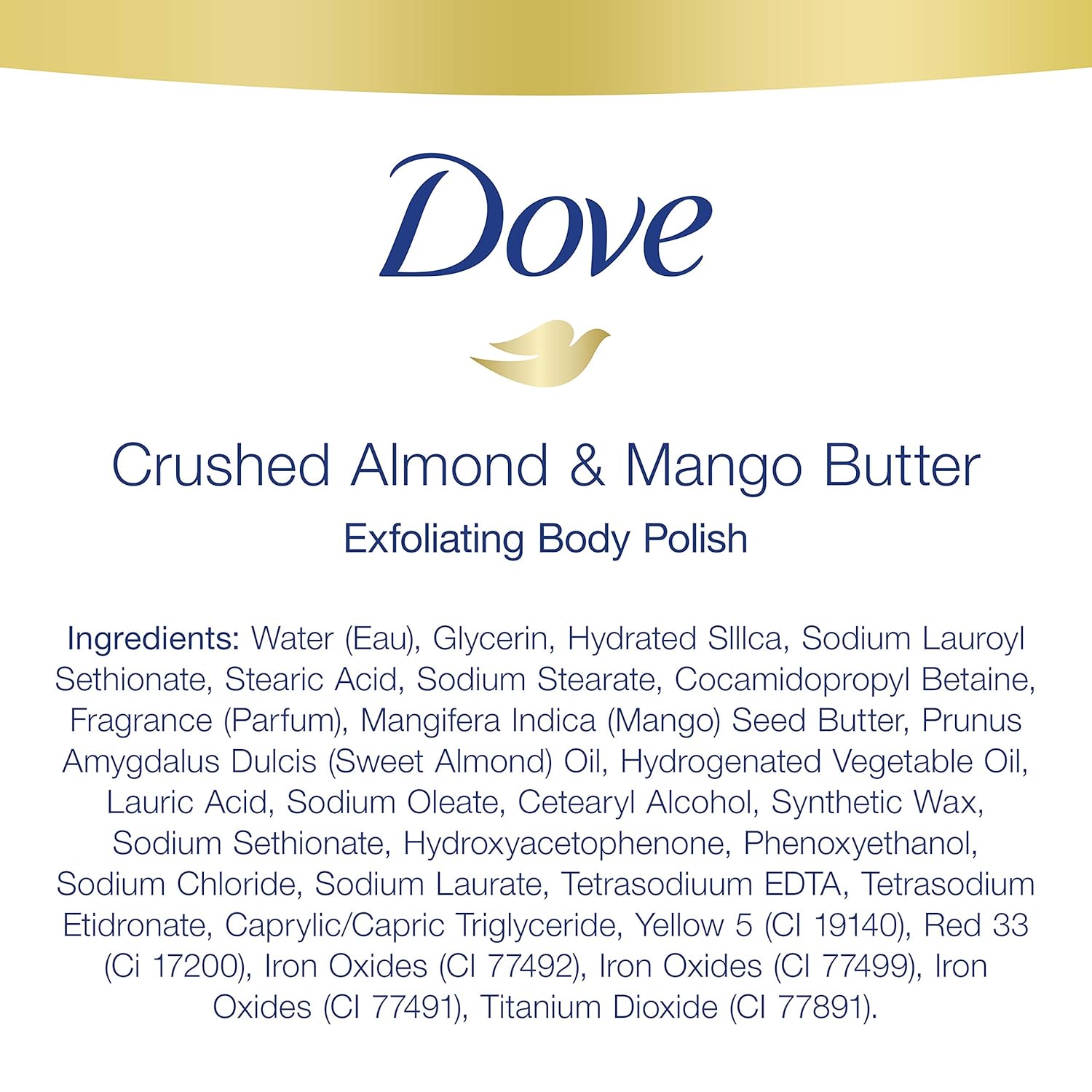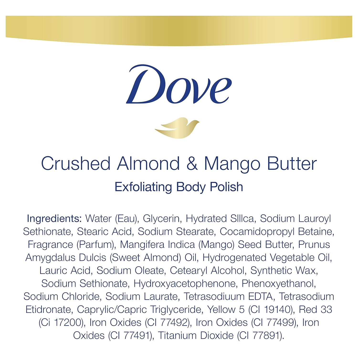 - DOVE CRUSHED ALMOND AND MANGO BUTTER BODY POLISH This gentle exfoliating body wash uses natural ingredients to reveal smooth, glowing skin