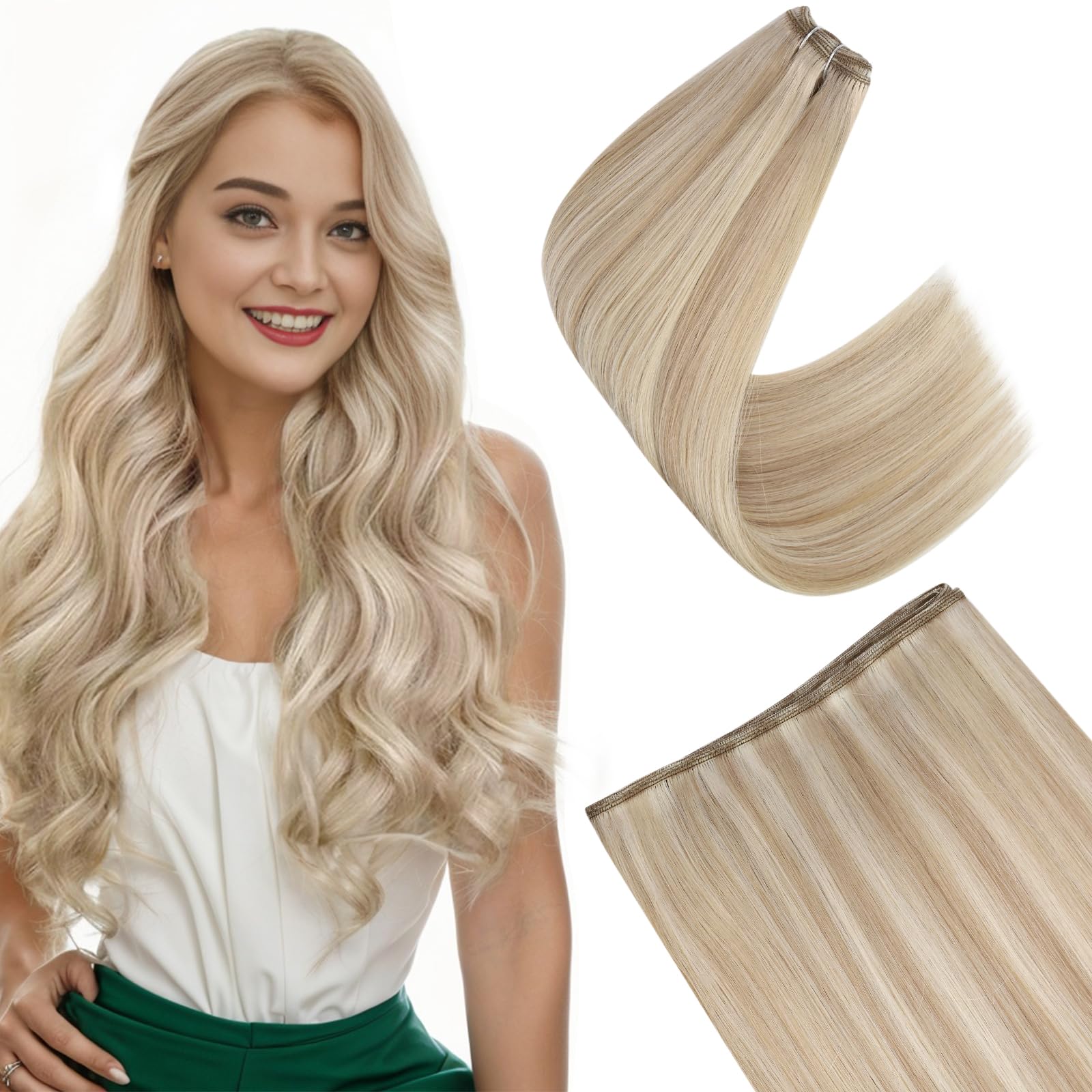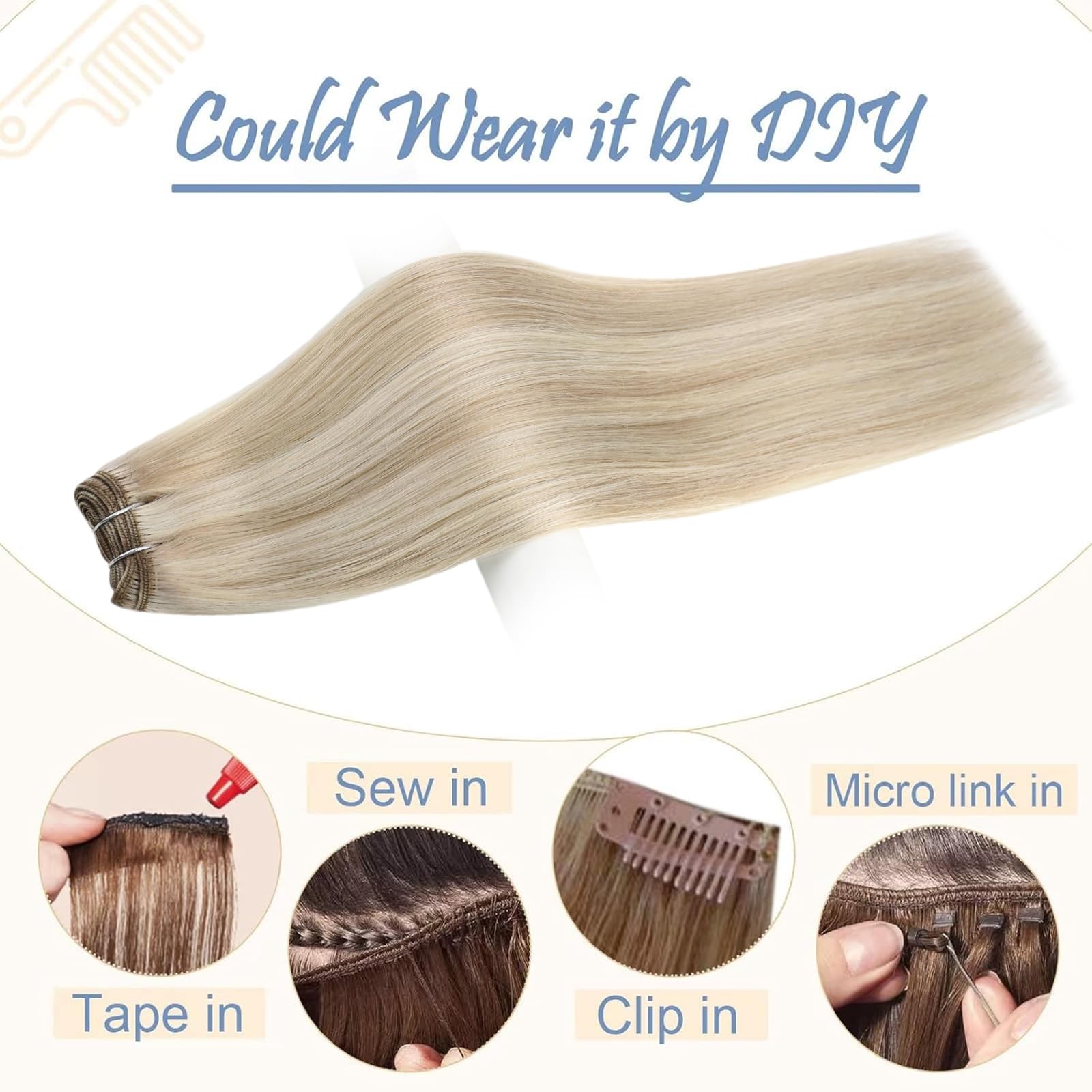 Easyouth Weft Hair Extensions Human Hair Sew in Hair Extensions Remy Hair Weft Ash Blonde Highlight Bleach Blonde Sew in Weft Hair Extensions Bundles 12 Inch 70 Gram
