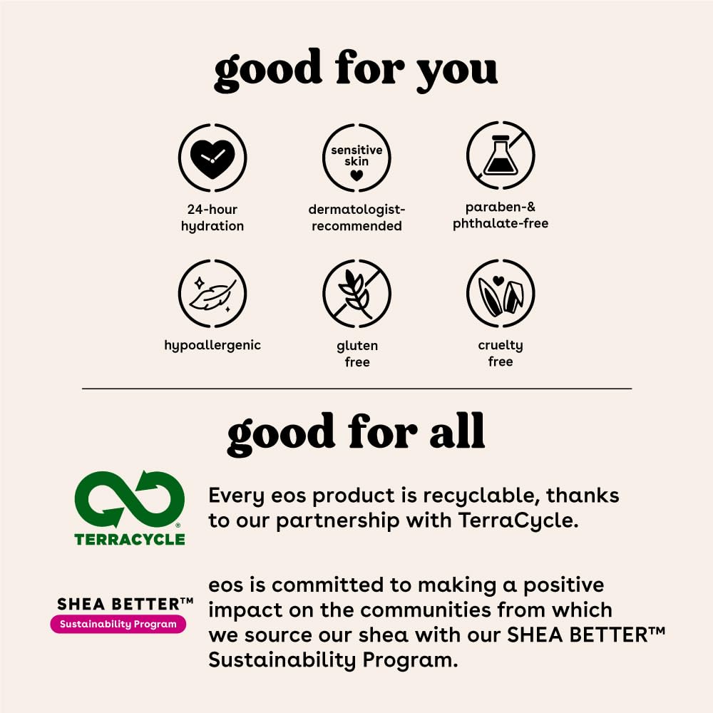 - MADE WITH SUSTAINABLE SHEA: Shea is a sustainable, renewable natural resource and through our Shea Better Sustainability program, eos is committed to making a positive impact on the communities from which we source our shea.