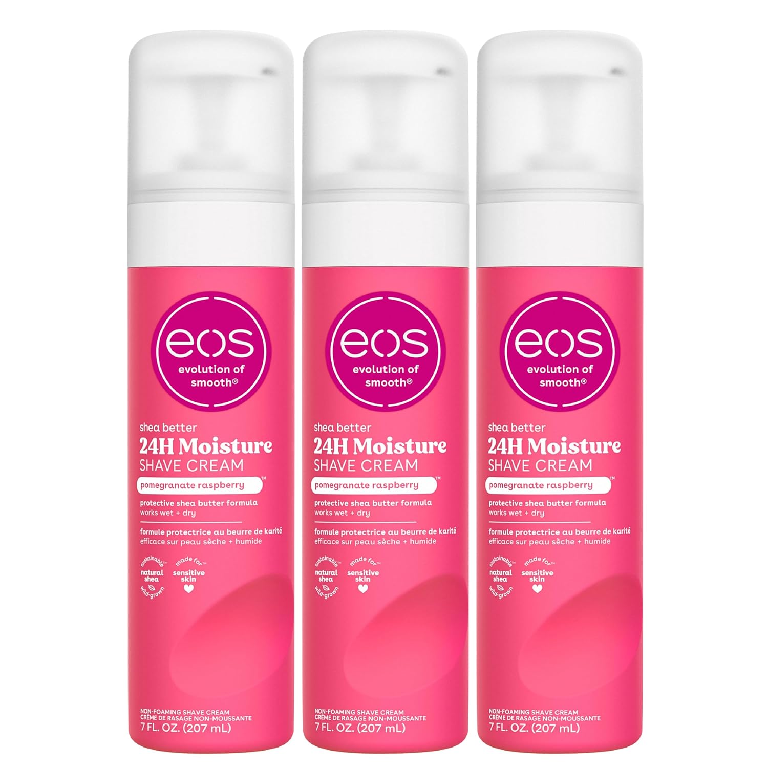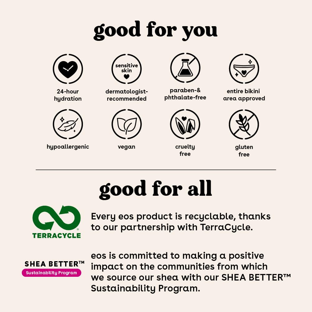 - ALL-NATURAL SHEA BUTTER: eos vegan shave creams have wild grown, sustainably sourced, 100% natural shea butter to make your skin feel moisturized, protected, and soft. eos shave cream + body lotion for dry skin are paraben, phthalate and gluten-free. Leaping bunny certified. No products tested on animals.