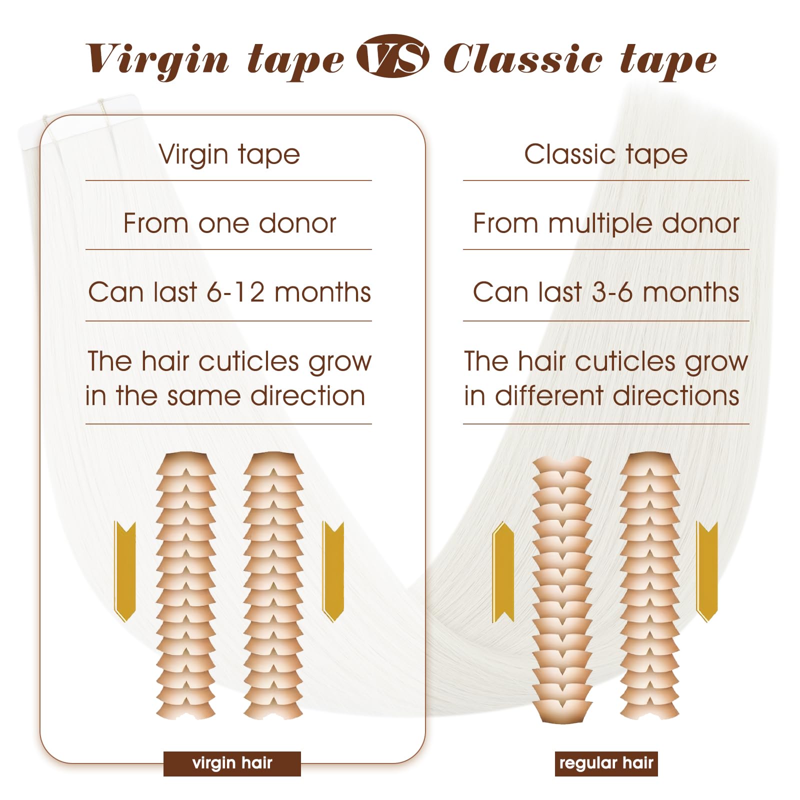 - Natural Movement: Virgin Tape In Extensions Have Natural Movement. The Unidirectional Cuticles Ensure That The Extensions Blend Effortlessly With Your Natural Strands, Creating A Look That Is Indistinguishable From Real Hair