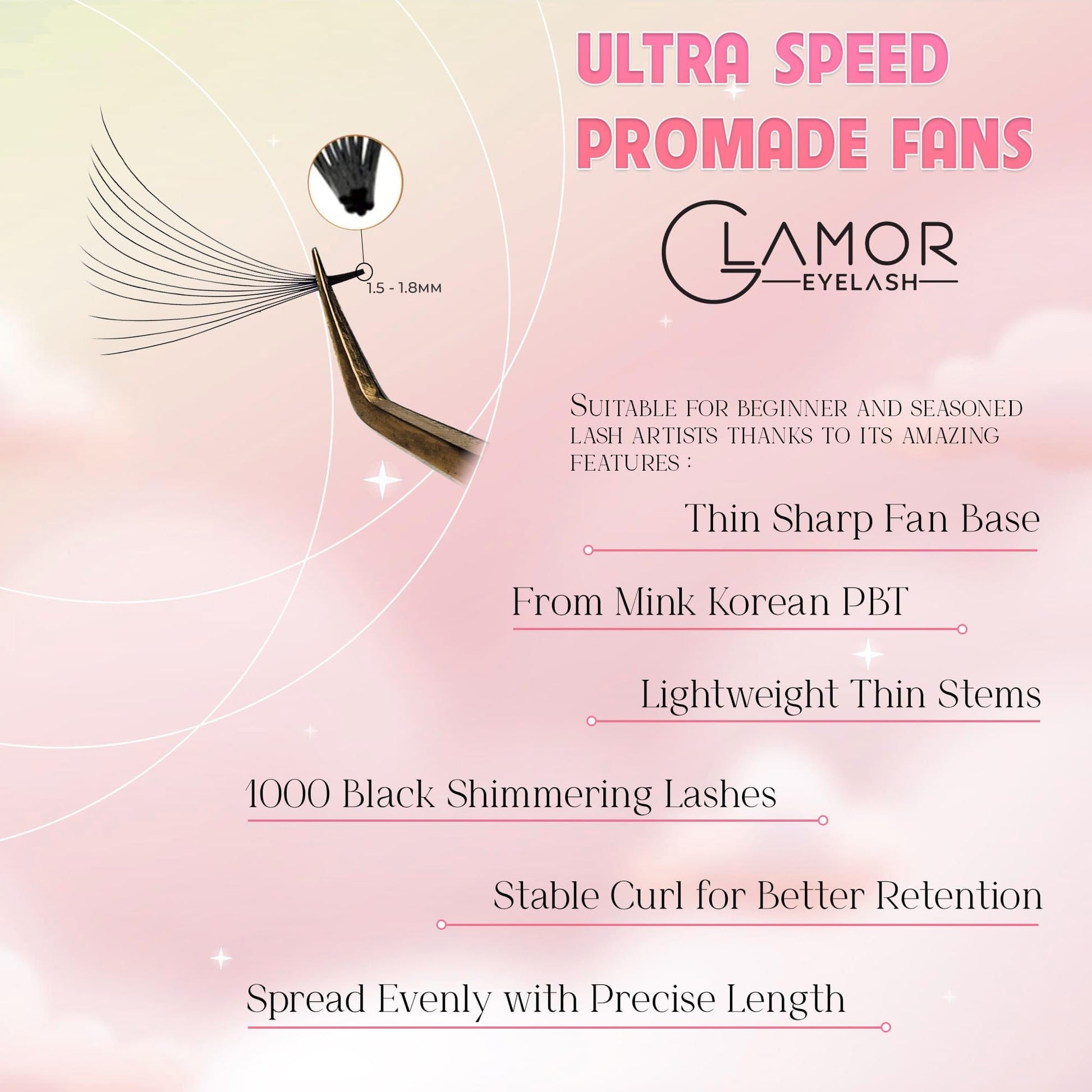 - š 1000 NARROW PROMADE FANS: Our lash clusters package includes huge number of soft, comfortable, and affordable Promade Lashes Natural Look, which is more than enough to provide your customers a flawless look. You can trust our high-quality eyelash extension kit because it is created solely by the Glamor careful staff.