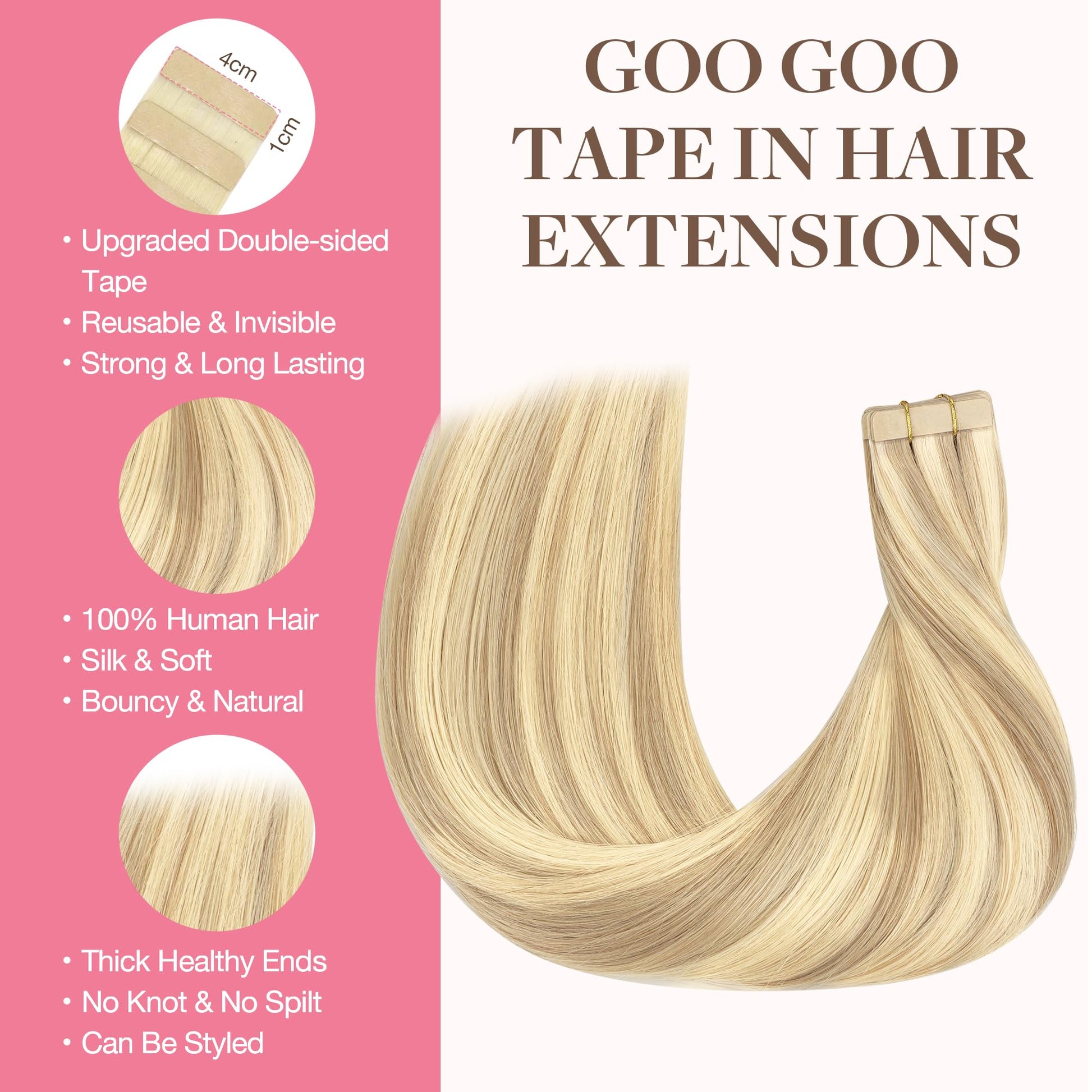 GOO GOO Tape in Hair Extensions Human Hair, 18D/22F Dirty Blonde Highlights, 10inch 50g 20pcs, Thick Ends Straight Seamless Tape in, Invisible Tape in Hair Extensions Human Hair
