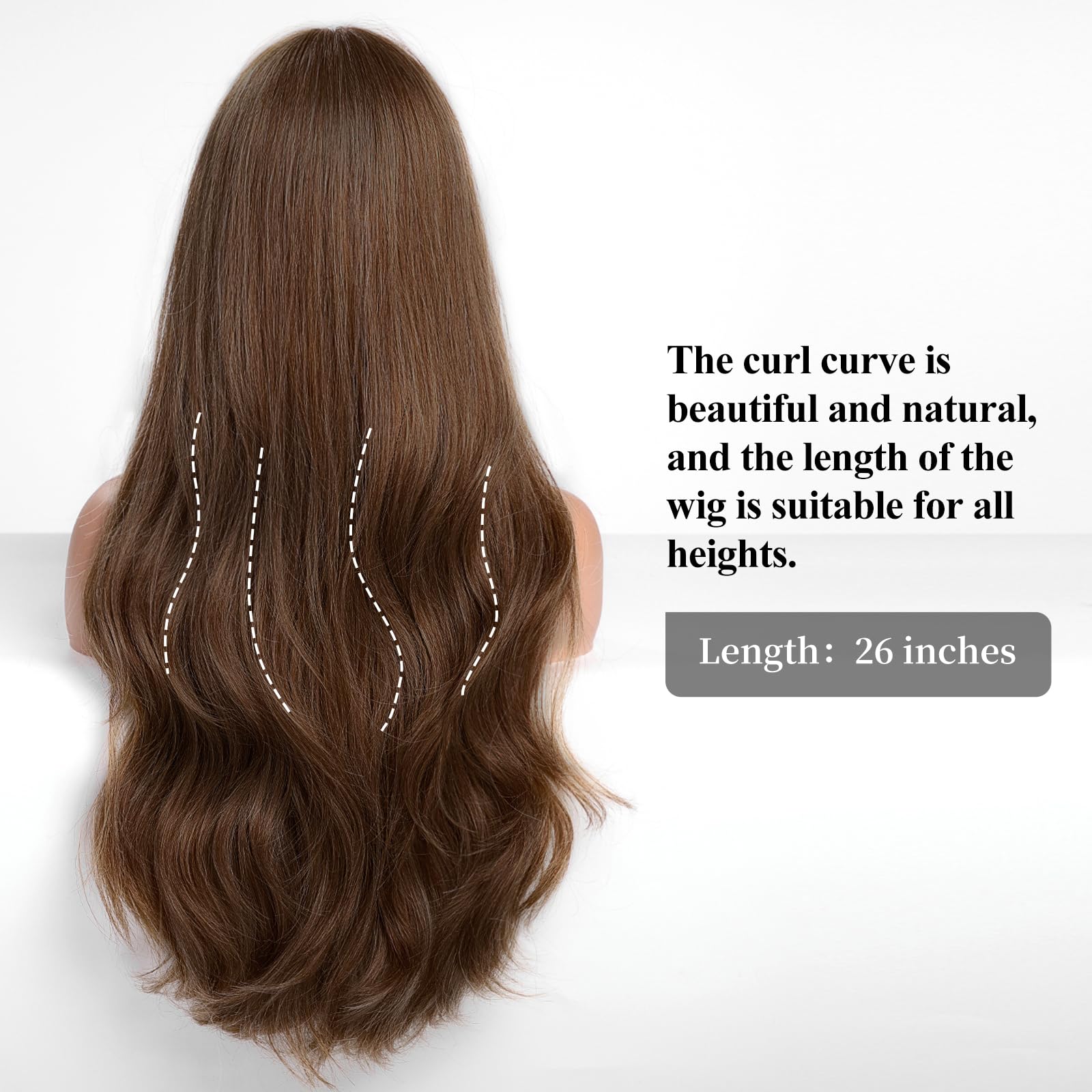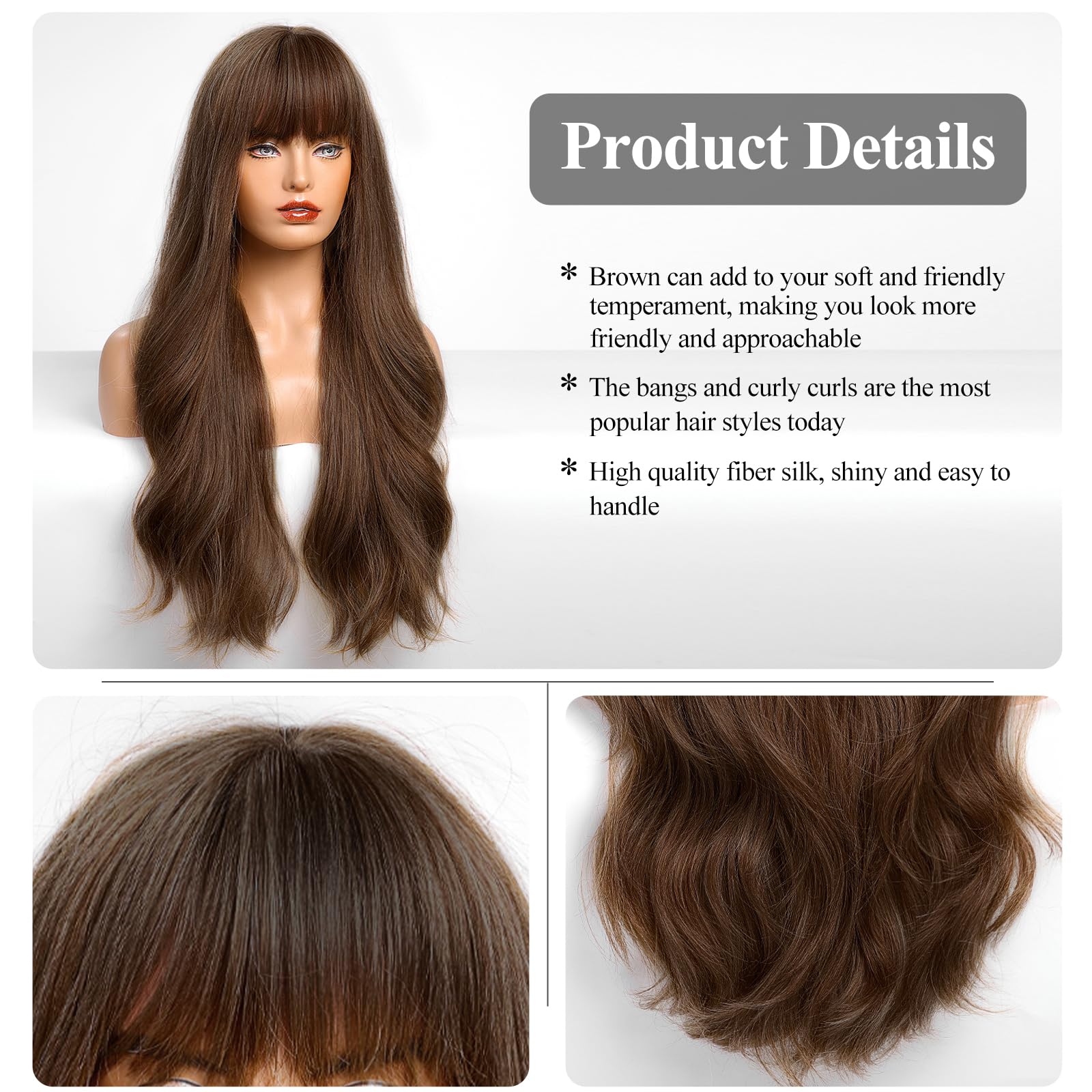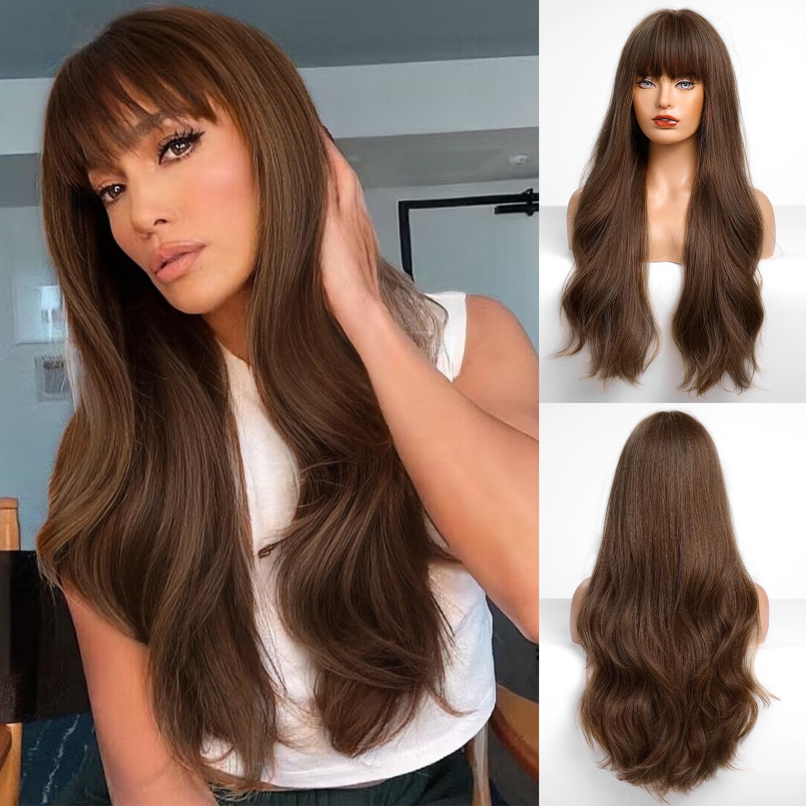 HAIRCUBE Brown Wig with Bangs for Women Brown Long Wavy Hair Wig Wig Curly Wavy Synthetic Wigs for Girls Daily Party Use