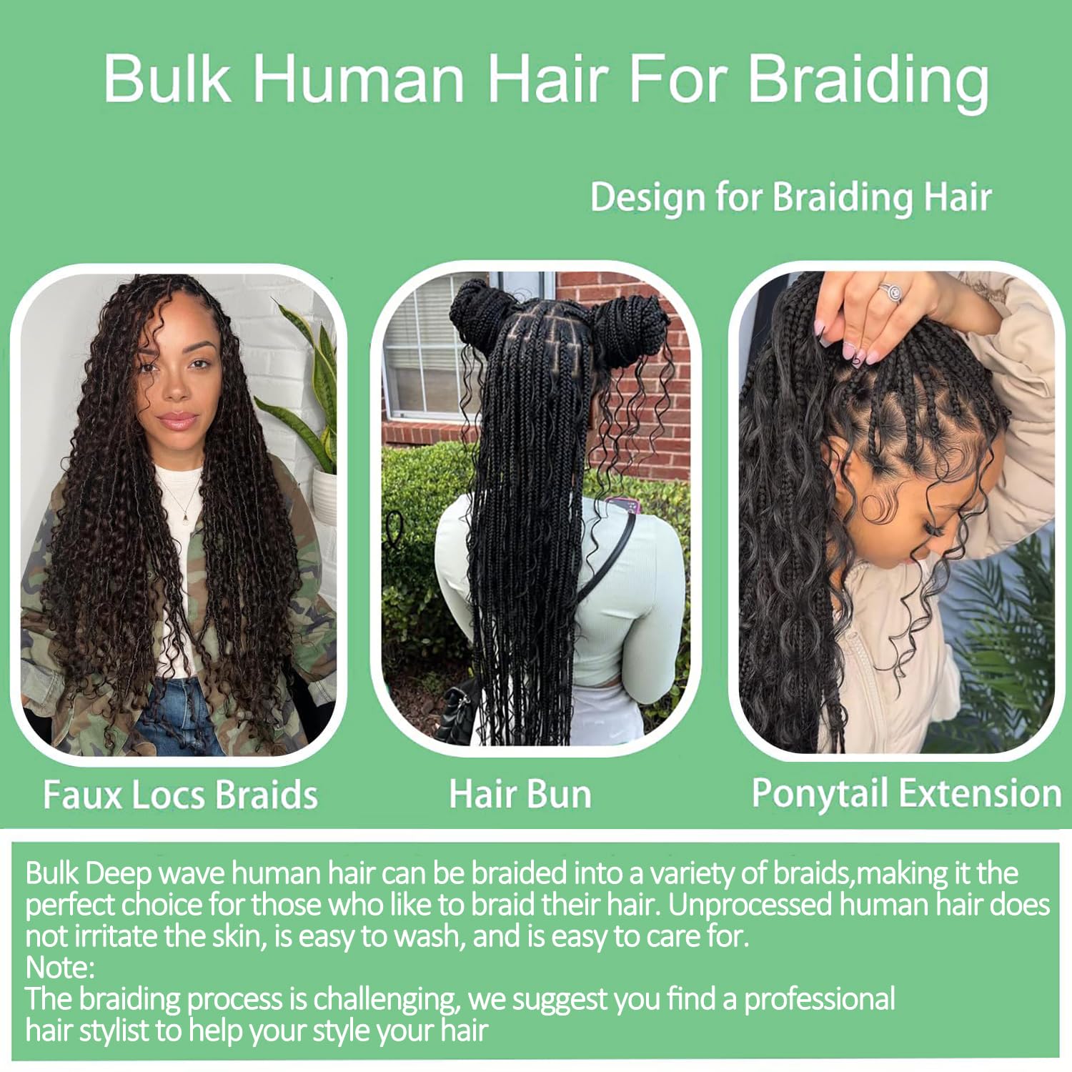 - Boho Braids Human Hair Suitable for any Occasion: Our Deep Wave bulk human hair is different from the general hair extensions,there is no weft, making it incredibly versatile for various braiding styles. Such as bohemian braids, knotless Boho Braids, box braids, cornrows. You can also use it to add length and volume to your natural hair. Suitable for daily life,wedding,dating,graduation ceremony,vacation,parties soon.