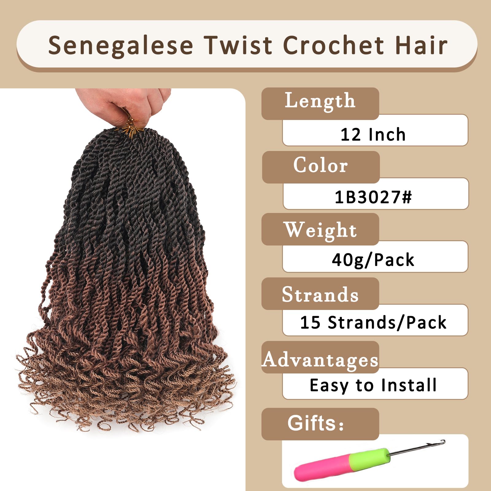 - Package -- Wavy Senegalese Twist Crochet Hair 15 strands/pack,8 pack/Lot.Length:12 Inch,Weight:320g/8 Pack.Usually 6-8 Pack can full a head,and our wavy senegalese twist crochet hair comes with a crochet hook gifts.More choices,more beauty.easy to install!