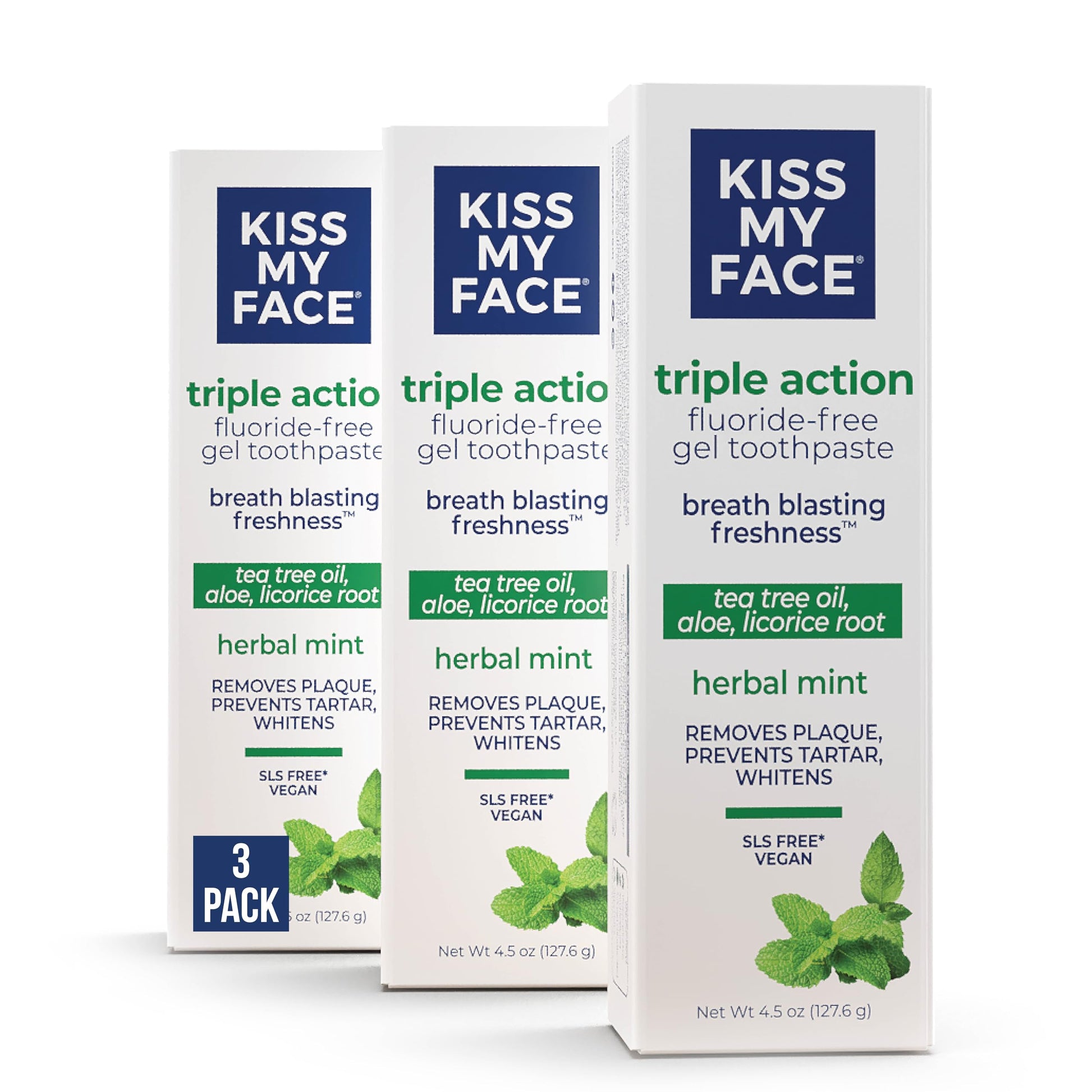 Kiss My Face Triple Action Toothpaste Gel, Herbal Mint Flavor, Removes Plaque, Whitens Teeth, Prevents Tartar, with Tea Tree Oil and Aloe, Fluoride Free, Vegan, 4.5 oz, 3 Pack