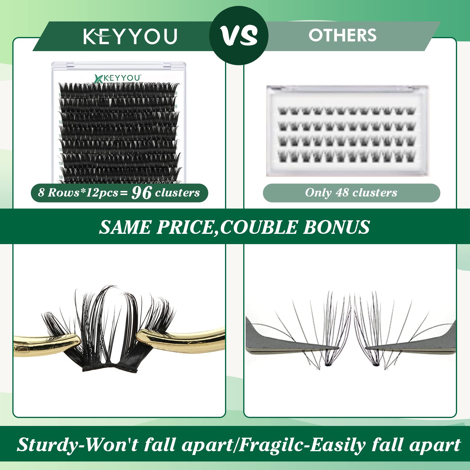 - 【Soft&Comfortable】KEYYOU lash cluster are made of imported materials,the stem line is thinner and softer, the eyelash cluster are lighter and more comfortable to wear.96 clusters in one tray ,more cost-effective.