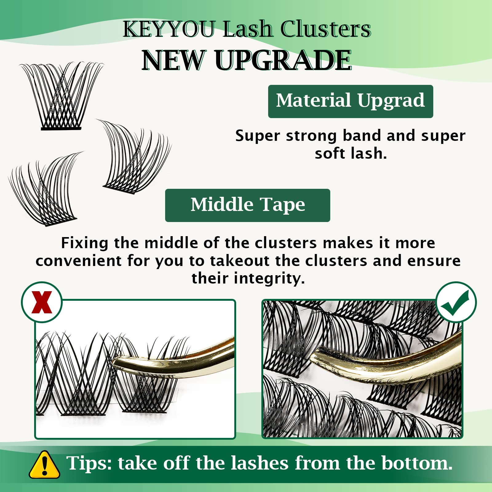 - 【Soft&Comfortable】KEYYOU lash cluster are made of imported materials,the stem line is thinner and softer, the eyelash cluster are lighter and more comfortable to wear.96 clusters in one tray ,more cost-effective.
