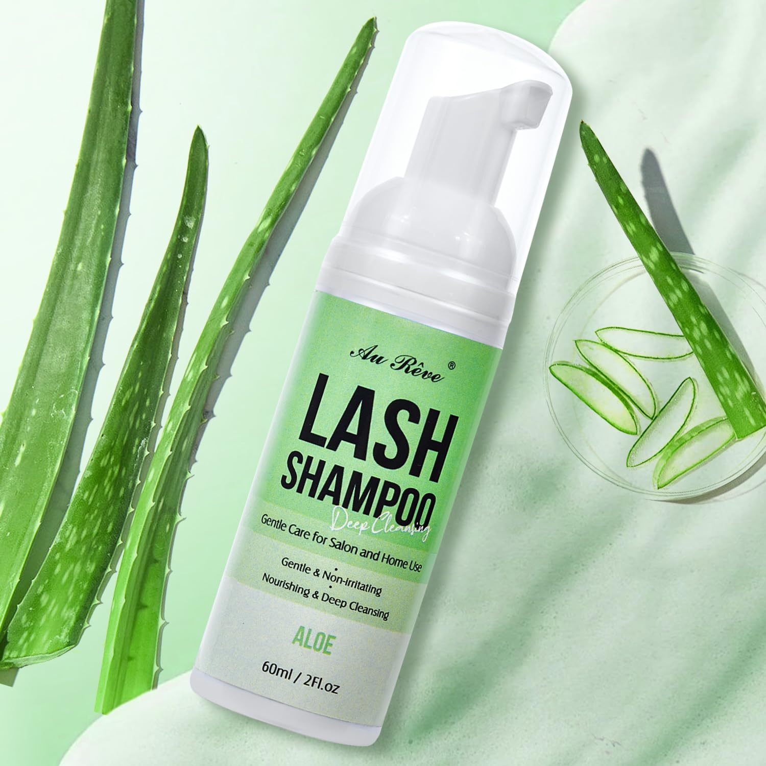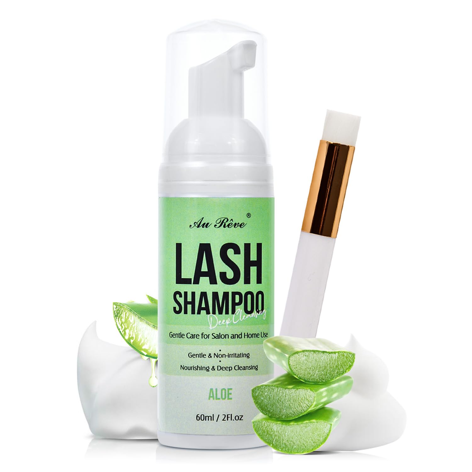 Lash Shampoo for Lash Extensions 60 Ml/2fl.oz Eyelash Extension Cleanser Oil Free Lash Cleanser for Eyelash Care, Gentle Foaming Eyelash Shampoo with Brush for Salon Home Care (Aloe 60ml)