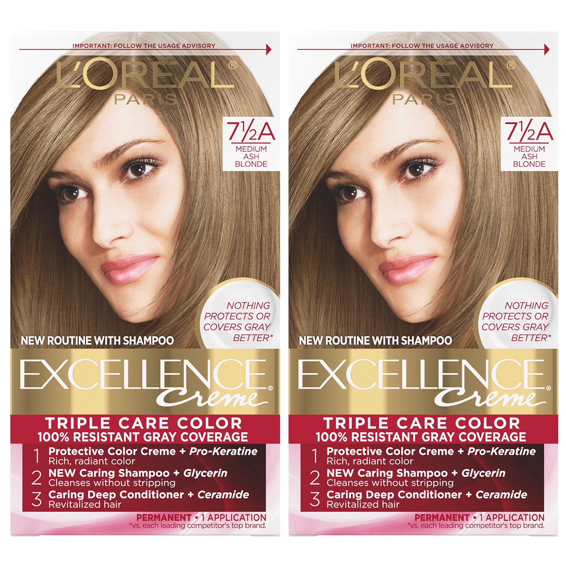 L'Oreal Paris Excellence Creme Permanent Hair Color, 7.5A Medium Ash Blonde, 100 percent Gray Coverage Hair Dye, Pack of 2