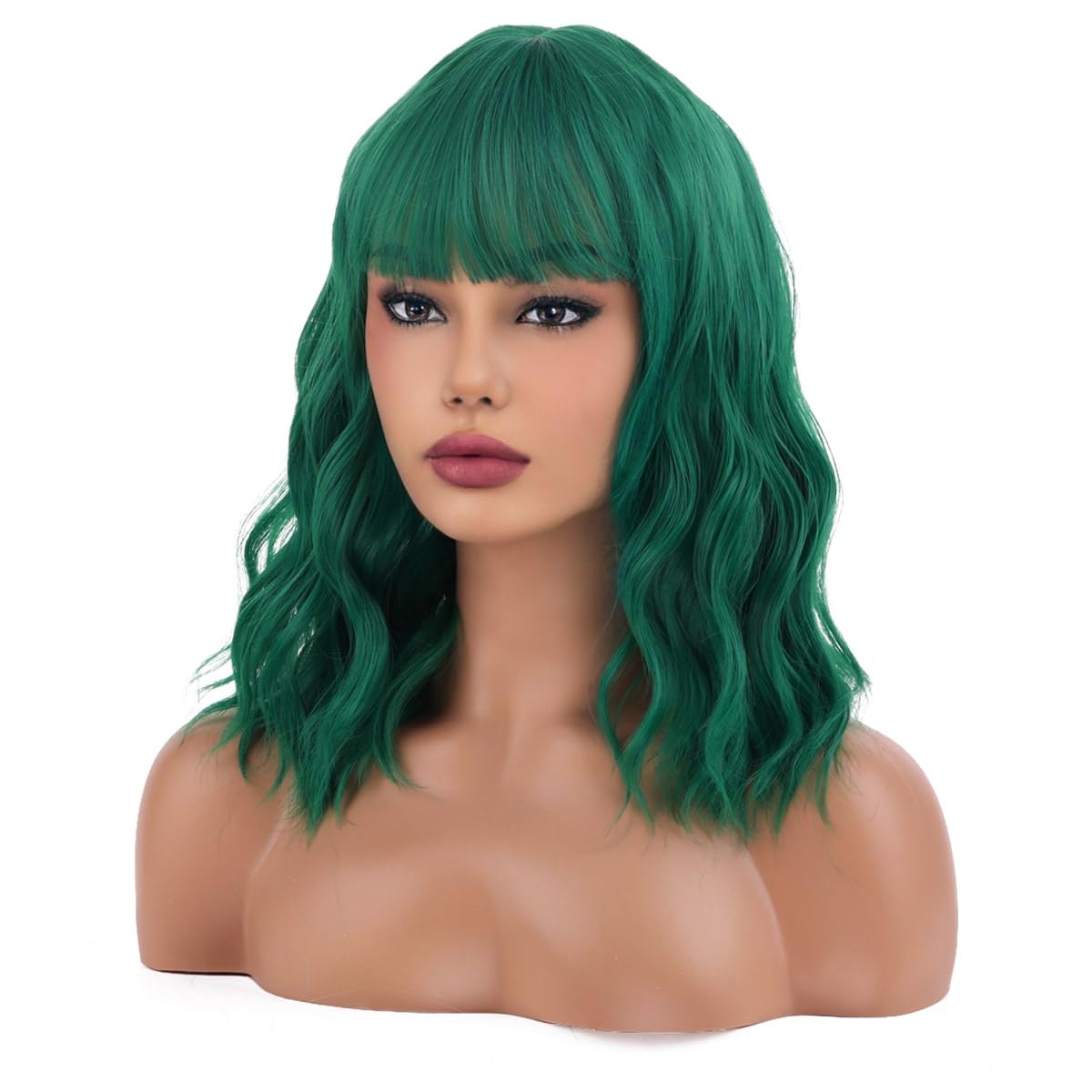 MAGQOO Green Wig Women Girls Emerald Green Bob Wig Short Curly Wavy Green Wig with Bangs St Patrick Halloween Party Wigs Synthetic Heat Resistant