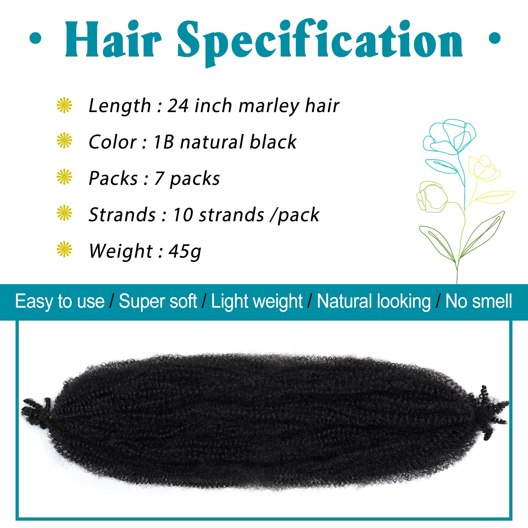 Marley Twist Braiding Hair 24 Inch 7 Packs Cuban Twist Hair Springy Afro Twist Hair Marley Hair for Soft Faux Locs Crochet Hair Pre Separated Spring Twist Hair Kinky Twist Hair for Braiding (1B#)