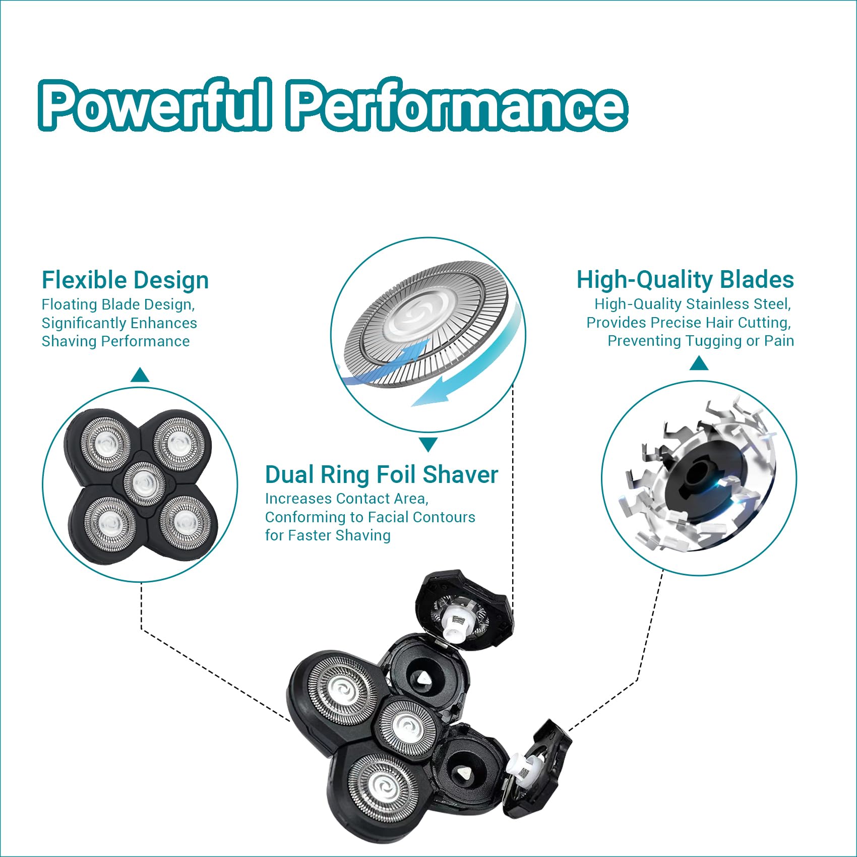 - Five-head shave for a cleaner and more thorough shave, with fully floating heads, dual-track cutters and durable titanium-coated blades.