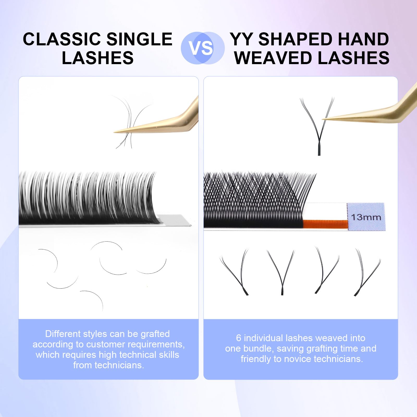 - Triple YYY LASH: This Y-shape eyelash has 6 extensions bonded together which is very simple to create fans when grabbing with tweezers, 3 tips in each side, no any skills needed. Get a 6D cluster instantly.