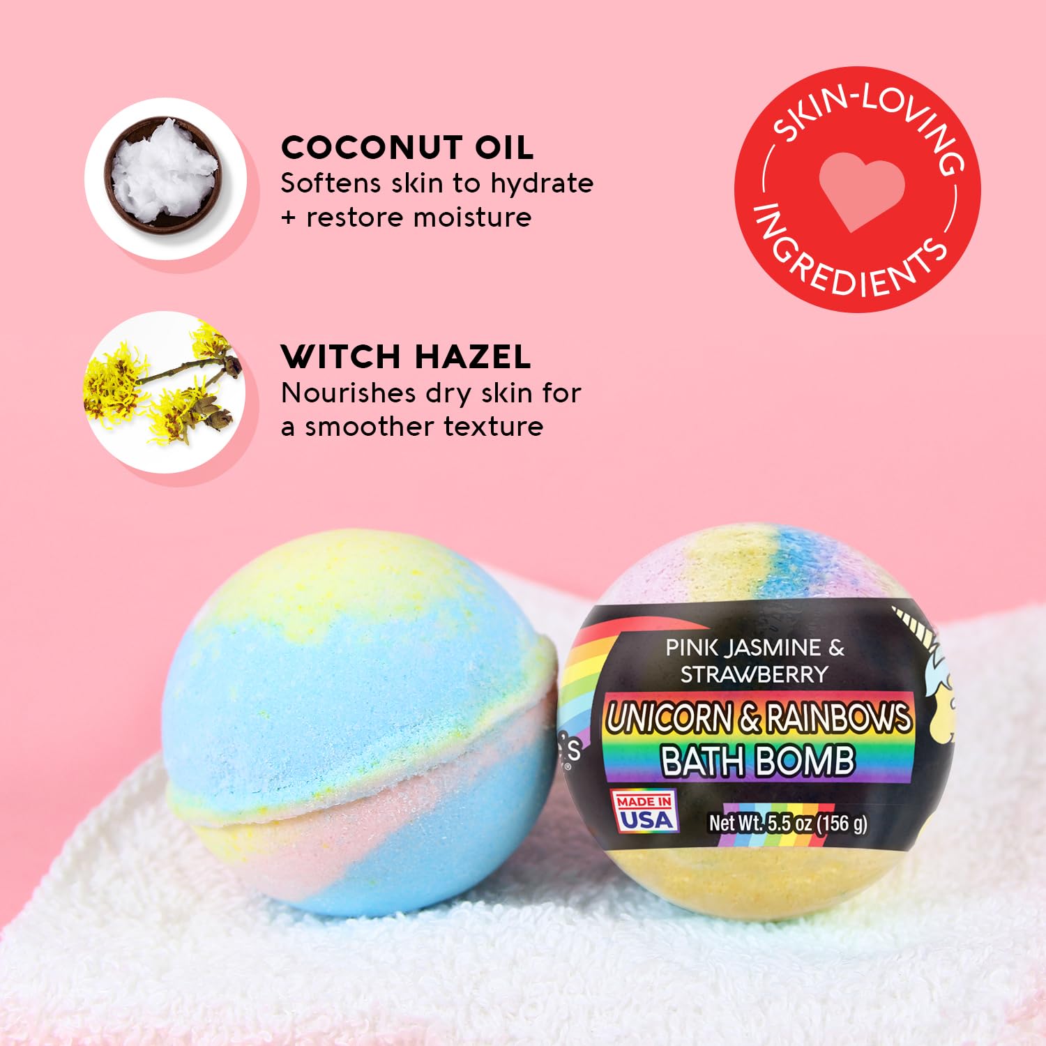 Nature's Beauty Unicorns & Rainbows, Pink Jasmine & Strawberry Scent Bath Bomb for Kids Multi-Pack - Natural, Non-Staining, Fun Bubbly Fizzy Spa Bomb, Made w/Coconut Oil + Witch Hazel, 5.5oz (4 Pack)