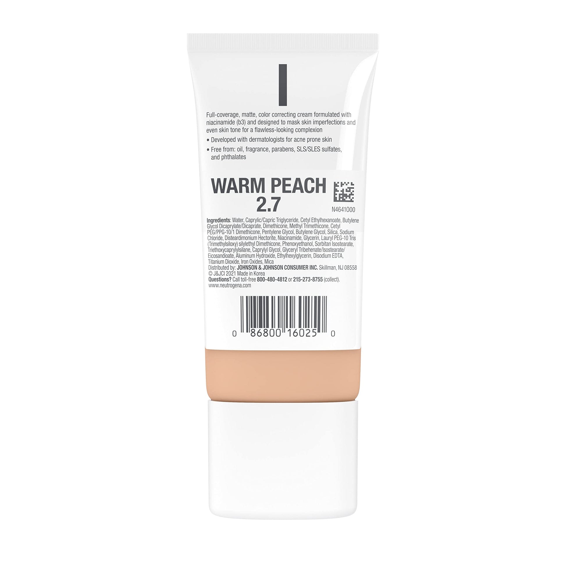 Neutrogena Clear Coverage Flawless Matte CC Cream, Full-Coverage Color Correcting Cream Face Makeup with Niacinamide (b3), Hypoallergenic, Oil Free & -Fragrance Free, Warm Peach, 1 oz