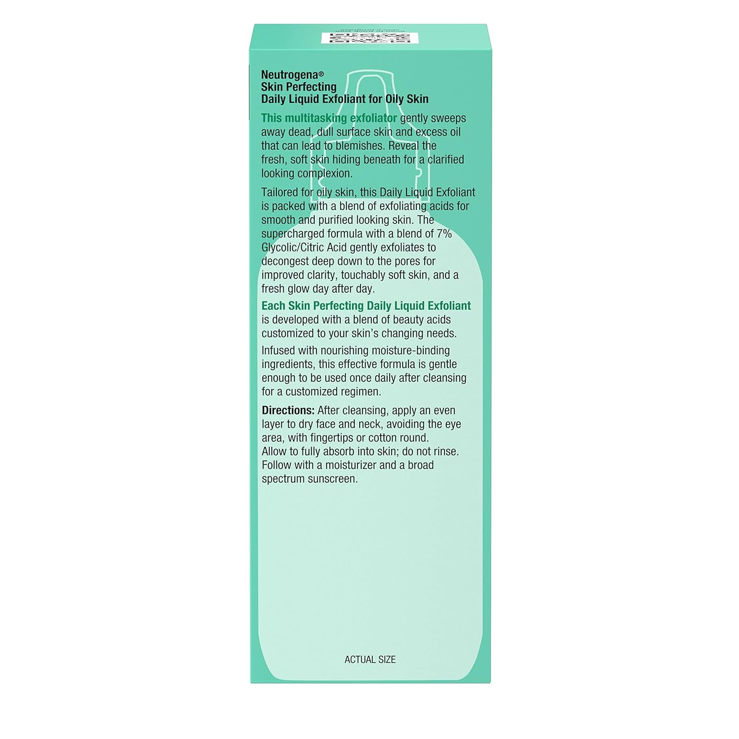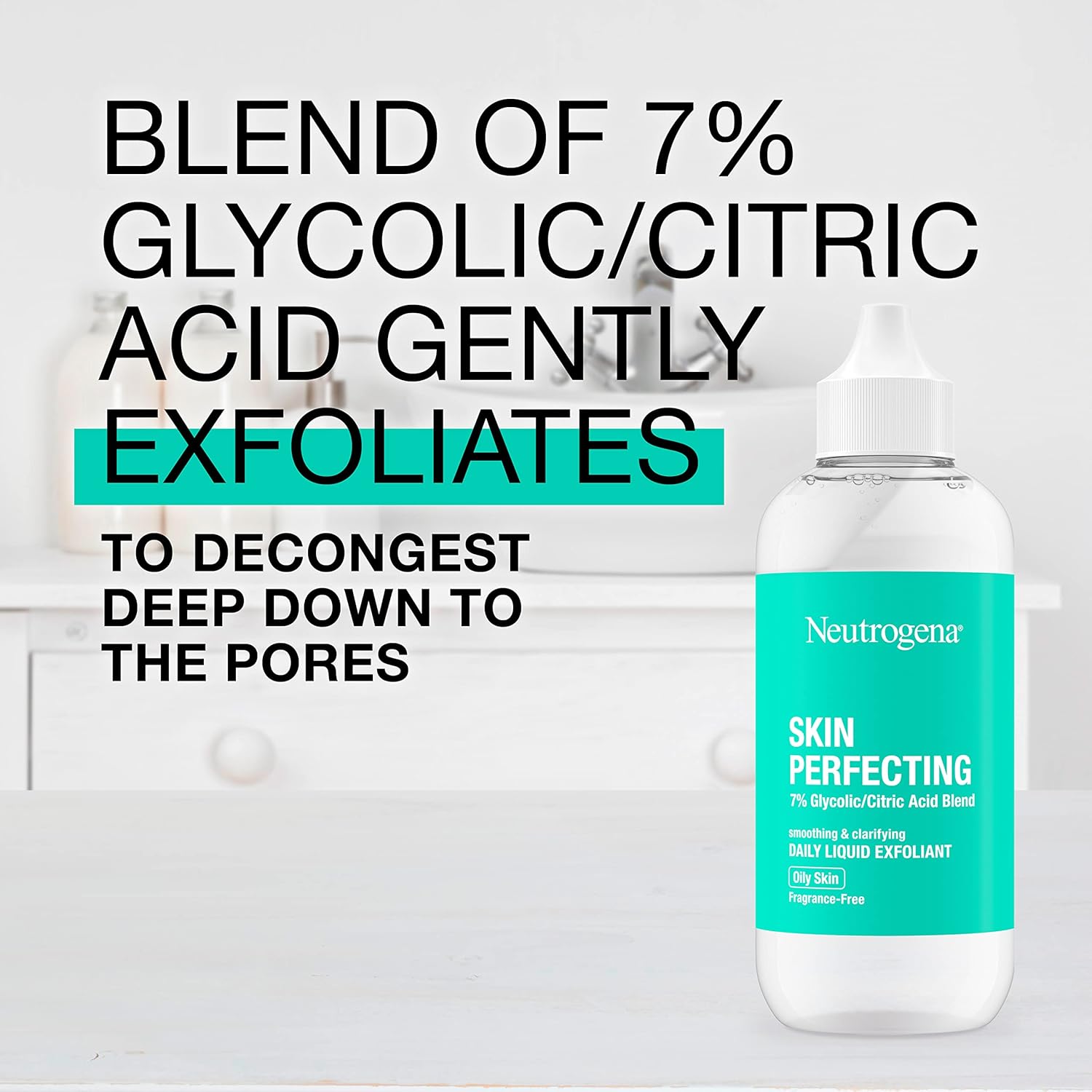 - 4-fluid ounces of Neutrogena Skin Perfecting 7% Glycolic/Citric Acid Blend Daily Liquid Facial Exfoliant for Oily Skin to gently sweep away dead, dull surface skin & excess oil to reveal fresh, soft skin & a clarified looking complexion