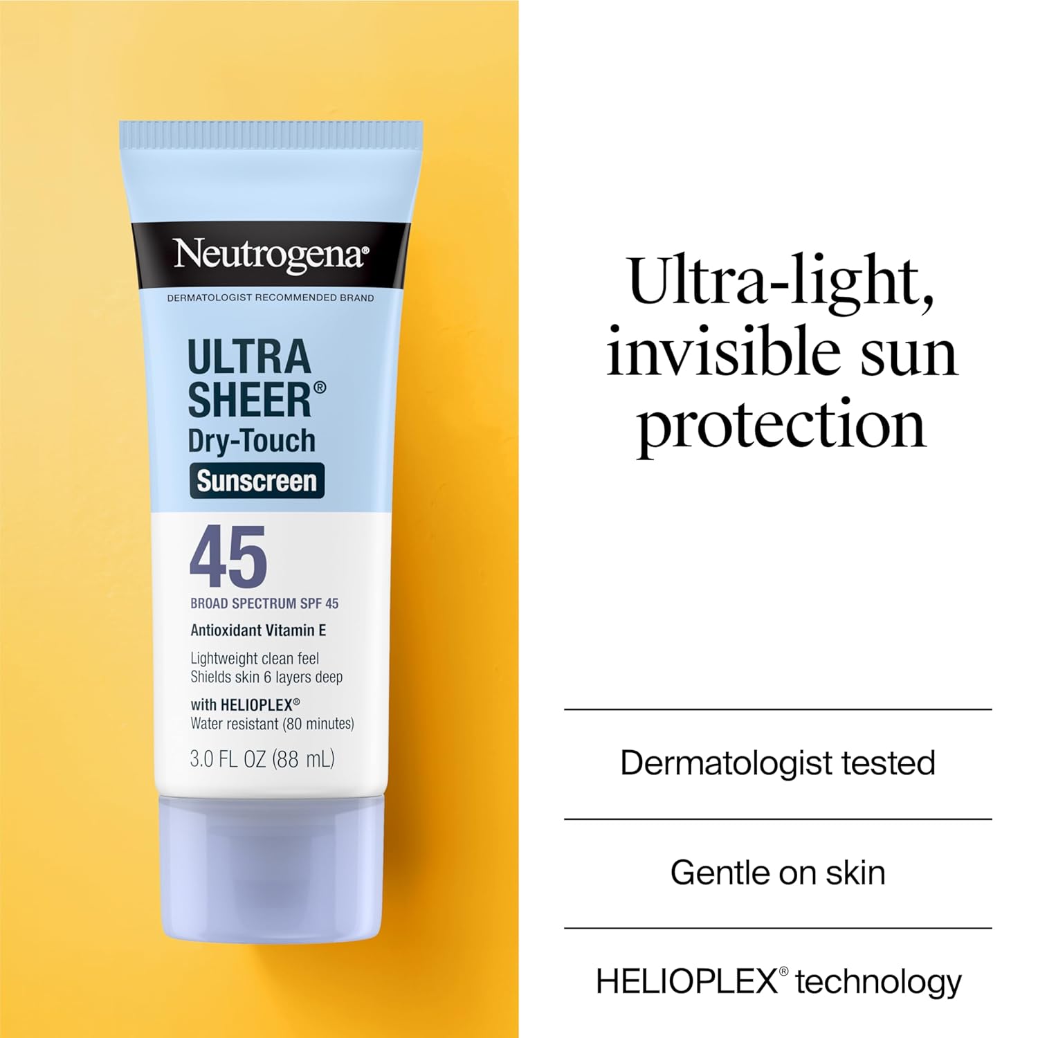 Neutrogena Ultra Sheer Dry-Touch Sunscreen with Broad Spectrum SPF 45 travel size sunscreen provides powerful sun protection that you will love to wear without the heavy finish. Featuring Avobenzone, Homosalate, Octisalate, Octocrylene as active ingredients, this non-greasy body sunscreen is oxybenzone free, Hawaii Act 104 compliant. With Helioplex technology to provide superior UVA/UVB protection from aging UVA rays and burning UVB rays. Enriched with antioxidant vitamin E, the lightweight SPF sun screen lotion with Dry-Touch technology absorbs fast for a clean, ultra-light feel and non-shiny finish. Lotion sunscreen formula is non-comedogenic and PABA-free. This Neutrogena sunscreen is water-resistant for up to 80 minutes and comes from a dermatologist recommended sun care brand. Apply prior to sun exposure to keep skin protected during outdoor activities like gardening, biking, hiking, boating or walking. Protect yourself as you get your daily dose of sunshine.