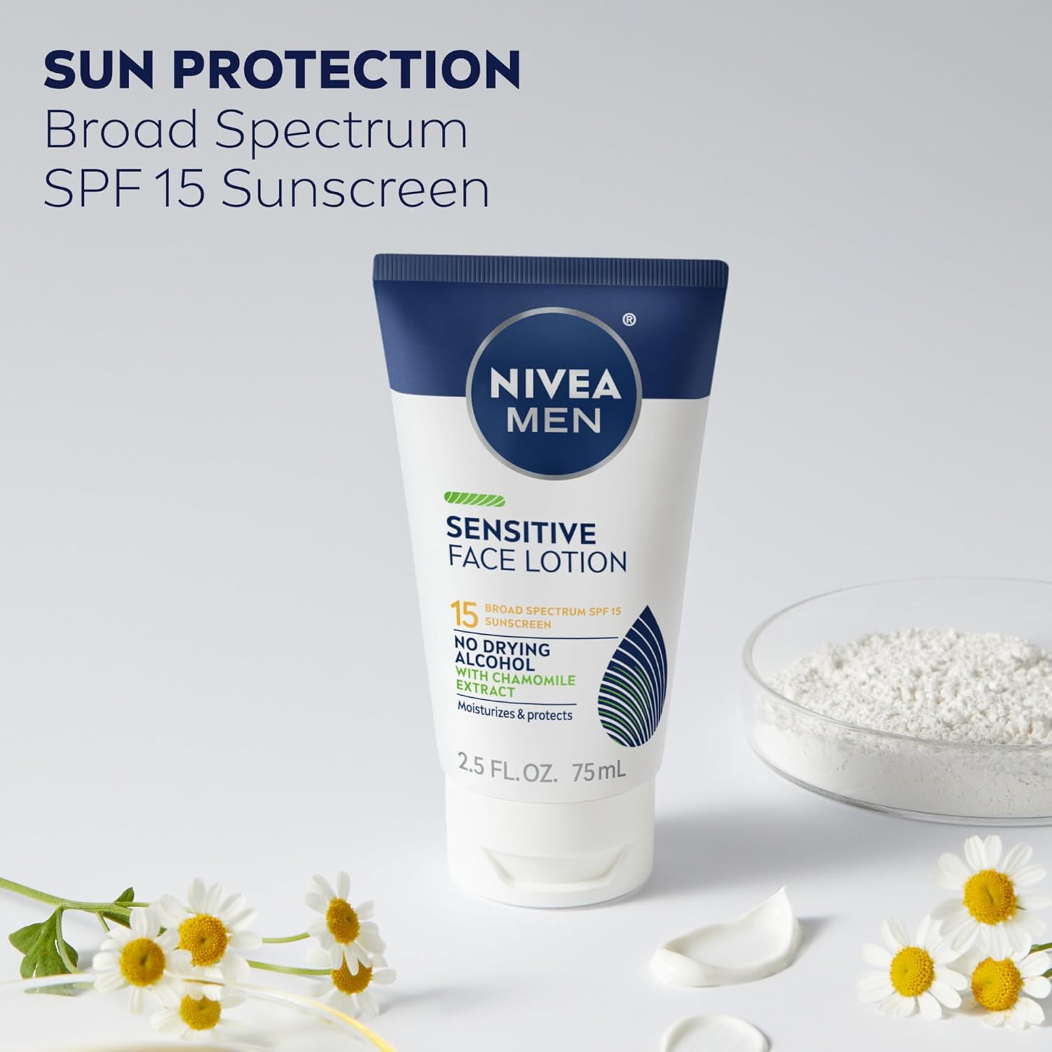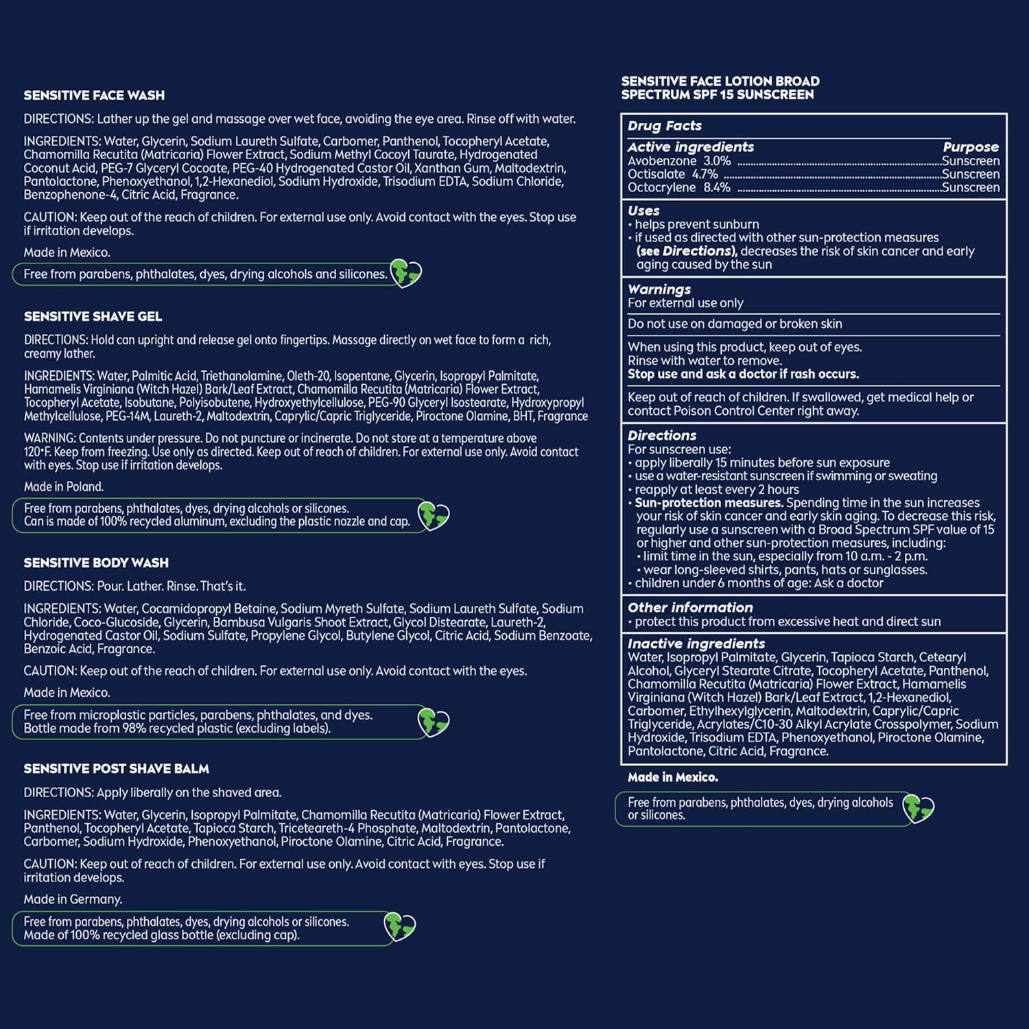 - INCLUDES: One (1) 5 fl oz tube of NIVEA MEN Sensitive Face Wash, one (1) 16.9 fl oz bottle of Sensitive Body Wash, one (1) 7 oz can of Shave Gel, one (1) 3.3 fl oz bottle of Soothing Post Shave Balm, and one (1) 2.5 fl oz tube of Face Lotion SPF 15