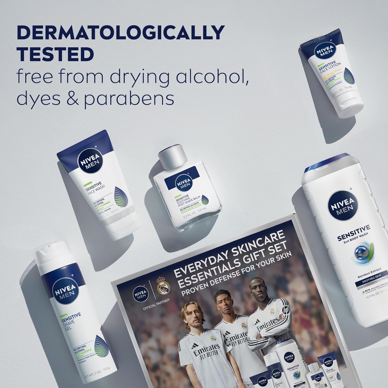 Cleanse, shave, soothe and moisturize with the everyday essentials in this NIVEA MEN Sensitive Skin Care Set. Formulated specifically for men with sensitive skin, this mens skin care kit helps you with a complete skincare regimen. Start by thoroughly cleansing your body with NIVEA MEN Sensitive Body Wash — enriched with soothing Bamboo Extract and Almond Oil for a formula that gently cleanses while providing nourishing moisture. Follow with NIVEA MEN Sensitive Face Wash to gently remove impurities, dirt and excess oils for visibly healthy-looking skin. Plus, it softens beard hair for a comfortable shave. NIVEA MEN Sensitive Shave Gel improves razor glide to help protect against nicks and cuts. After shaving, apply NIVEA MEN Sensitive Soothing Post Shave Balm liberally on shaved skin. This aftershave balm for men offers long-lasting, soothing hydration and absorbs quickly into the skin without any greasy feel. Finish your daily men's grooming routine with NIVEA MEN Sensitive Face Lotion SPF 15 to moisturize skin and help protect it from harmful UVA and UVB rays. Each product is dermatologically tested and free from drying alcohols, dyes and parabens. NIVEA is a trusted leader in skin care products with more than 130 years of skincare expertise.