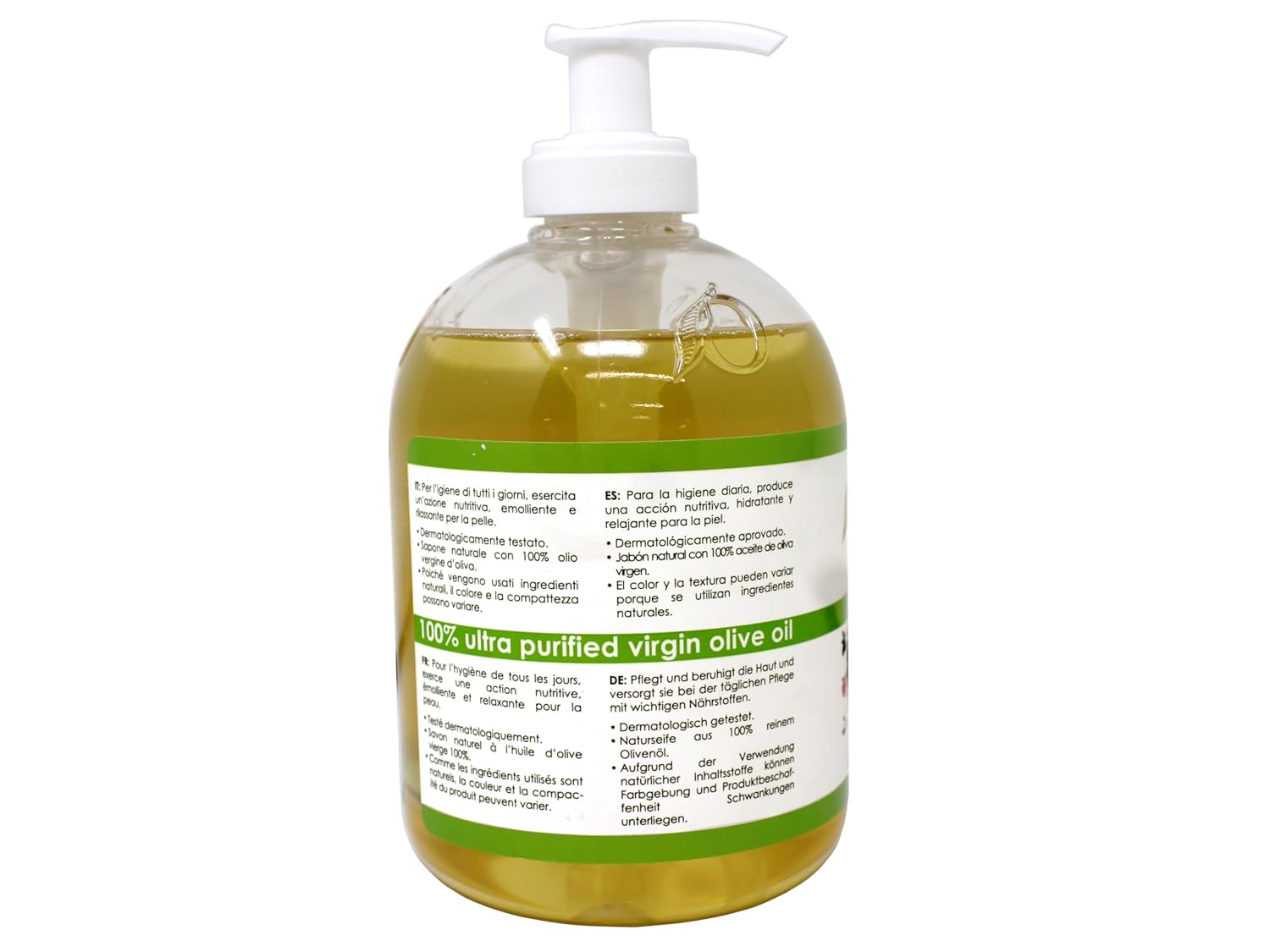 - Olivella Face and Body Liquid Soap is from 100% Ultra Purified Virgin Olive Oil: it is an all-natural soap that hydrates the skin as it cleanses.