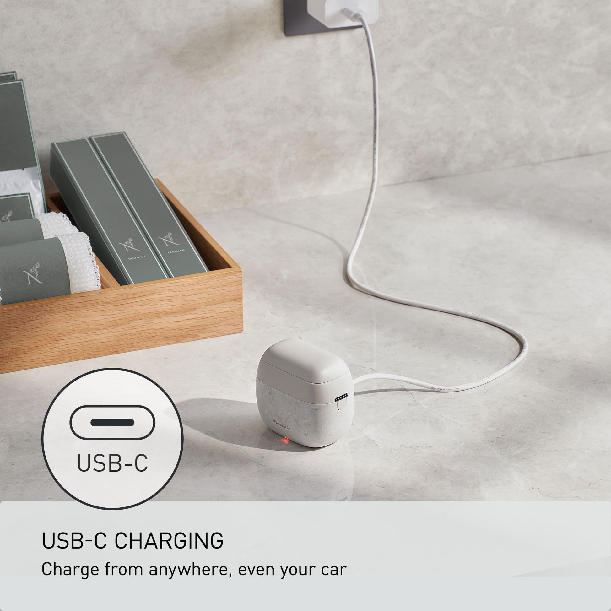 Details: A new era of shaving is here. The Panasonic ES-PV6A-W is the perfect blend of power and portability, in a compact rounded shape that fits seamlessly in the palm of your hand. The ES-PV6A-W delivers a nimble five-blade cutting performance, with flexible floating blades that hugs facial contours to leave skin smooth and free of stubble. The smart beard sensor automatically detects varying beard density, adjusting motor speed accordingly for a more comfortable shave experience. The sophisticated, innovative design gives you a new sense of control and maneuverability in the palm of your hand. And, the ES-PV6A-W is able to keep up with even the fastest-paced lifestyle; its smooth rounded shape is easy to slip into your bag for shaving at the gym, the office, or while on vacation or work trips. USB-C charging makes it easier than ever to charge, even in the car, with a full charge bringing 50 minutes of shave time. This waterproof wet/dry palm shaver provides a close shave with or without gel or foam, and rinses clean easily under running water. Crafted with care from NAGORI®, an innovative material made from byproducts of the treatment of seawater. These upcycled minerals reduce the use of plastic and gives the shaver an exquisite, ceramic-like texture -- a quiet luxury that makes a statement.