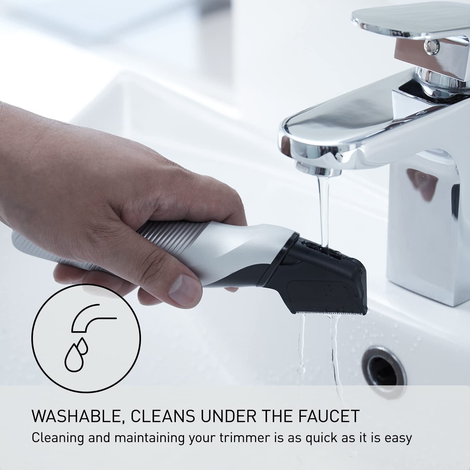 - Unique Design for Hard-to-Reach Areas: The mens body trimmer uses an I-shaped body and V-shaped head to easily shave in even narrow and complicated places such as the back, groin and buttocks