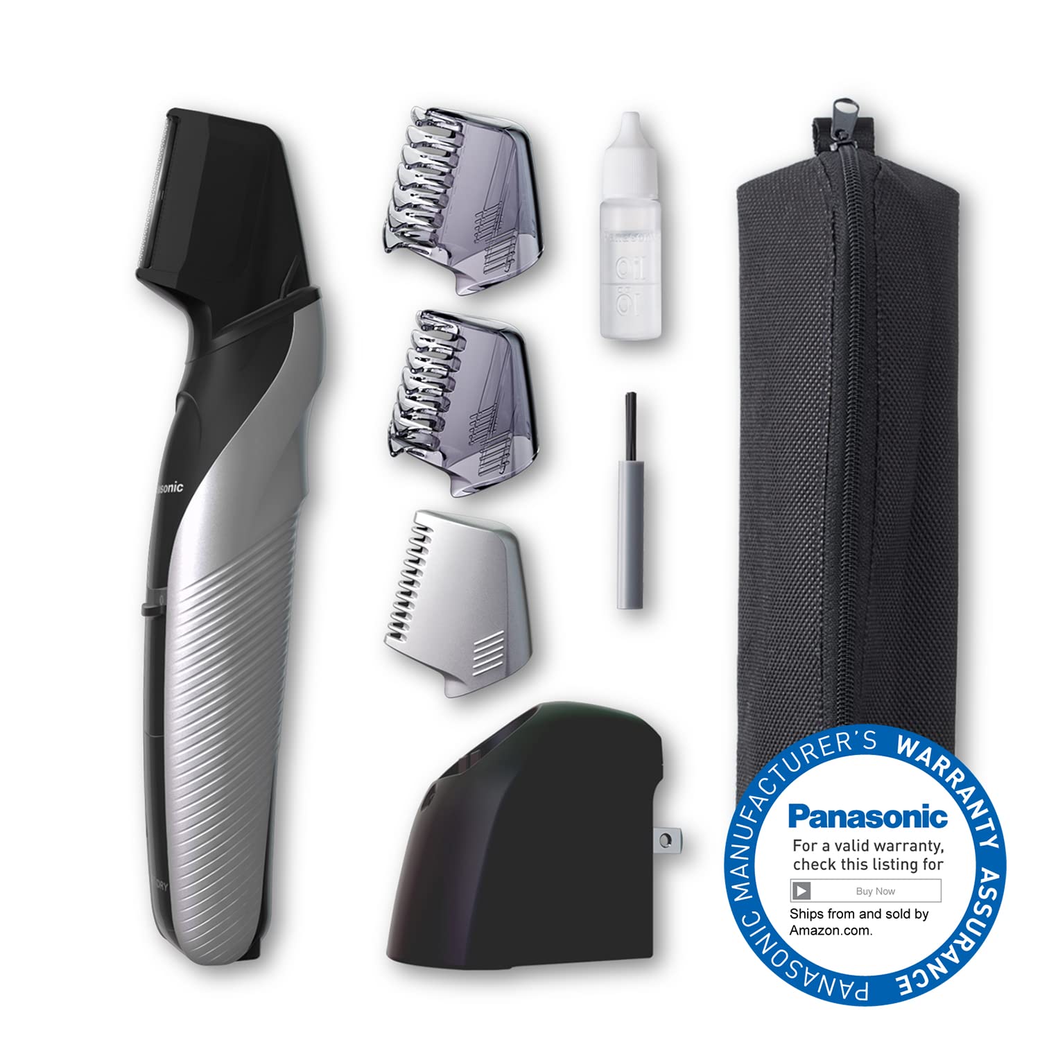 Details: The Panasonic Body Groomer for Men makes personal grooming in the most sensitive areas gentle and easy. The body hair trimmers wide-edge, hypoallergenic stainless-steel blade removes hair painlessly with minimal irritation, even on sensitive skin. The unique blade uses rounded edges to manscape gently in the most delicate areas of the body. And, the ultra-thin blade lets you trim as close as 0.1-millimeter, for a clean, smooth feel. A unique V-shaped head maneuvers quickly into and around hard-to-reach areas like the buttocks and groin, and the I-Shaped handle makes it easy to control trimming in various directions. The Panasonic electric trimmer for men includes three comb attachments to trim in lengths from 0.08-inch to 1/4-inch. With a cordless, waterproof design you can groom in the shower, with or without your favorite foam, or dry anytime. Neatly store and charge the ER-GK60-S on the AC wall charger without messy cords. One 8-hour charge provides up to 40-minutes of grooming power. A soft travel case is included to easily pack for vacations. To maintain peak performance, rinse under water after every use and replace blade when dulled, about once every three years, with Panasonic trimmer replacement model WER9500P.