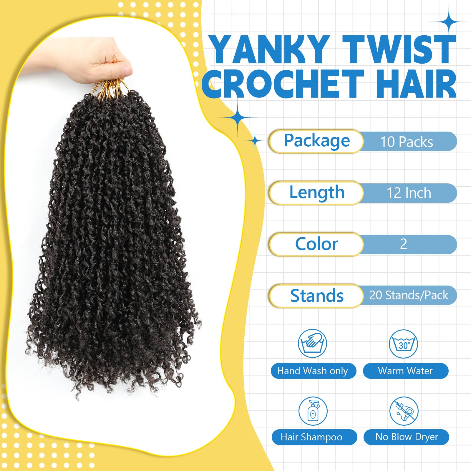 - 【Yankee Twist Crochet Hair Features】: Our new style yankee twist crochet hair is pre-twisted, with natural little curls at the ends, very cute. Light and shiny, and will feel very relaxing to wear without any weight on your hair while ensuring fullness. With simple care, this hair can last long time and our passion twist crochet hair is very durable.